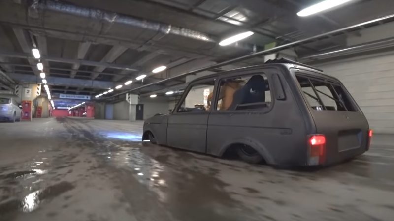 Az átalakítás célja vélhetően minden idők leglaposabb Nivája lehetett, ezt alighanem sikerült is kivitelezni. Annyira, hogy nem álltak meg a rugók levágásánál, lecsapták az egész alját a lökhárító vonalában, majd teljesen egyedi padlólemezt építettek hozzá. A négyhengeres motornak nyilván nem maradt hely a géptető alatt, de amúgy a kerekeknek sem, ezek kikandikálnak a motorháztetőn, a teljes hátsó tengely pedig a hátsó ülések helyét foglalja el. Kapott állítható légrugózást, hogy a közlekedéshez szükséges pár centit is abszolút nullára csökkenthessék parkoláskor, kivették az ablakokat és a beltérből sem maradt sok. A látvány döbbenetes, és az autó még mozogni is egész ügyesen tud, elöl már nincs hajtás, így különösen szürreális, ahogy a fél Nivával a frissen hullott hóban driftelnek.