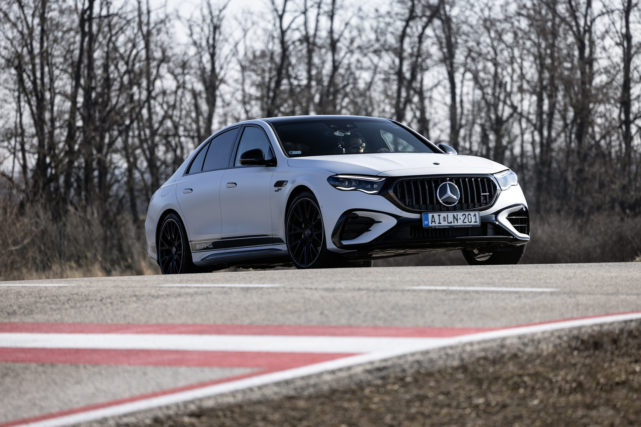 A feljebb említett nüansznyi különbségek tehát abból is adódnak, hogy a hibridség miatt 2,3 tonnás üres tömeggel áll rajtvonalhoz az E 53. A tömeg pedig mindig is a sportautók ellensége volt, de az AMG mérnökei fantasztikus munkát végeztek. Őszintén szólva szkeptikusan vártam, hogy mit tud az így elnehezült sportlimuzin, de kellemes meglepetést okozott. Igazából a sikánokban maradt alul fordulékonyságban, ám a tempós kanyarokban – amelyek előtt nincs különösebben nagy lendületvesztés – irtózatosan jól tapad és a kanyarcsúcspontokat tökéletesen lehet támadni a tűpontos kormányszerkezettel. Jó, hogy ebbe a modellbe is megrendelhetők a komolyabb kagylóülések, mert aki zárt pályára viszi, biztos, hogy azokkal jár jobban.