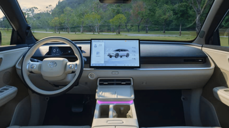 A belső tér is modern és letisztult, a 8,8 colos LCD műszerfal és a 14,6 colos lebegő infotainment uralja a műszerfalat. A szórakoztató rendszer szíve egy Qualcomm Snapdragon 8155 processzor, ami támogatja a hangfelismerést és a távoli frissítéseket is. Kérhető még 32 színű hangulatvilágítás, hét légzsák, 11 Yamaha hangszóró, vezeték nélküli telefontöltés, panoráma napfénytető és a hátsó ülésekhez összecsukható kartámasz is. Tipikus Kínának szánt különlegesség ez, amiről itthon hiába álmodunk, főleg azért az összegért, amiért a Népköztársaságban árulják a belpiacos Toyotát.