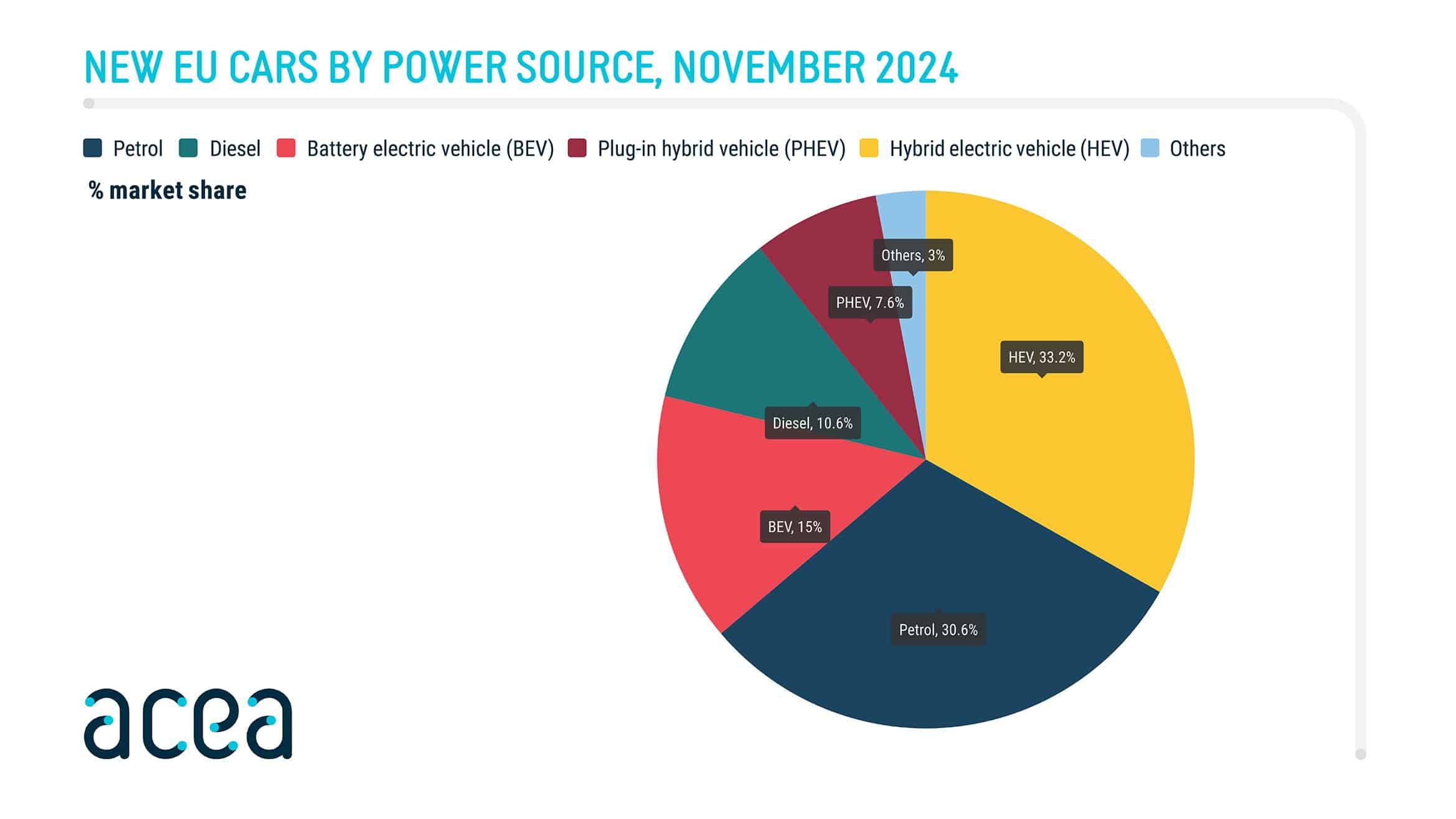 Hajtásláncokat vizsgálva a villanyautók visszaesése látványos, hiszen 9,5 százalékos csökkenést volt novemberben. A konnektoros hibridek még nagyobbat estek 8,8 százalékos csökkenéssel, viszont a full hibridek eladása 18,5 százalékkal nőtt. Valószínűleg az utóbbiak igyekeznek kiszorítani a sima benzines és dízel modelleket, ugyanis benzinesből 7,8 százalékkal kevesebbet adtak el, dízelből pedig 15,3 százalékkal kevesebbet.