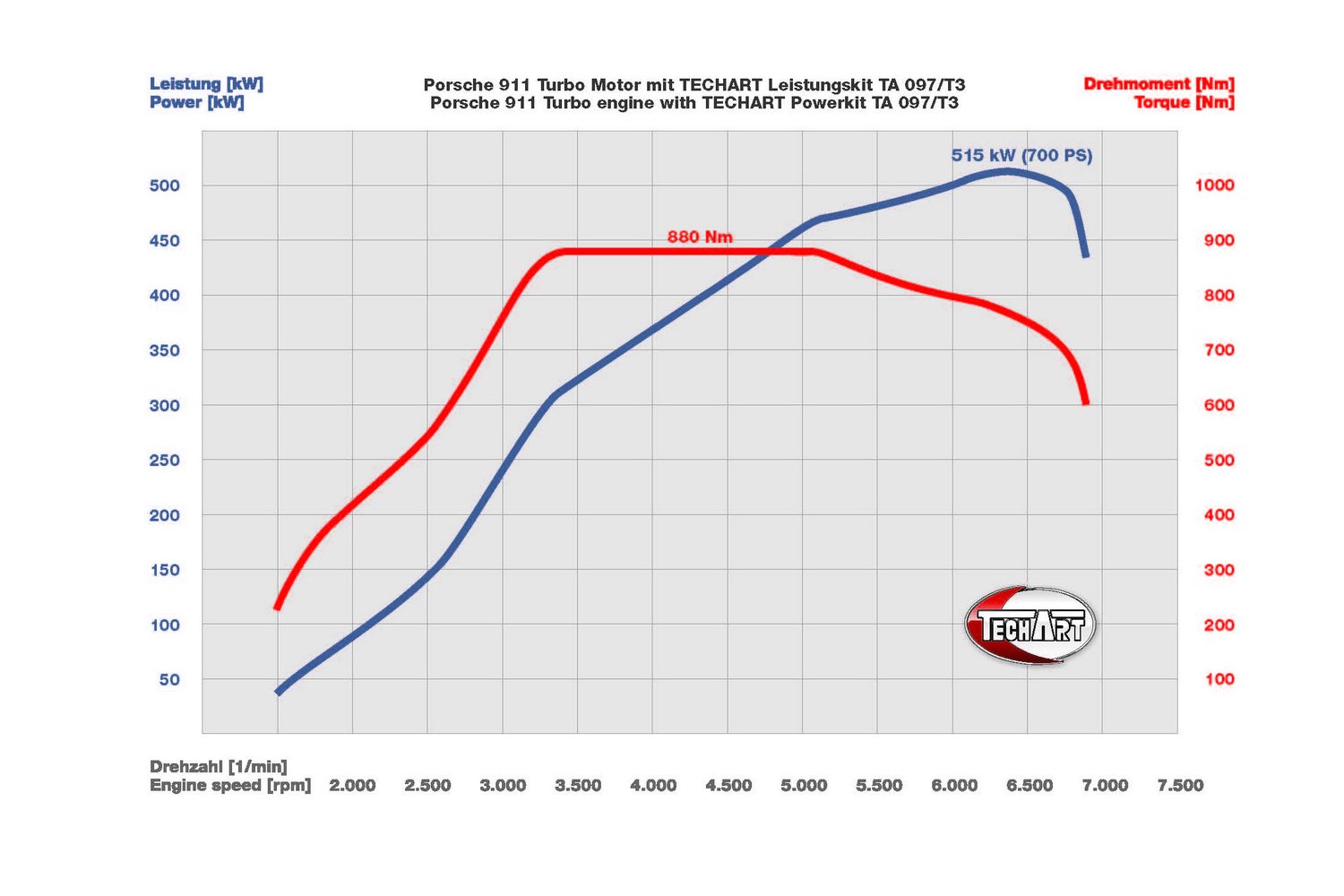 A gyárilag 500 lóerős és 650 Nm legnagyobb nyomatékú 3,8 literes boxermotor a Techart csomaggal átalakítva nem kevesebb, mint 700 lóerős teljesítményt és 880 Nm-t szabadít a kerekekre, ami a menetteljesítményt is durván megdobja.