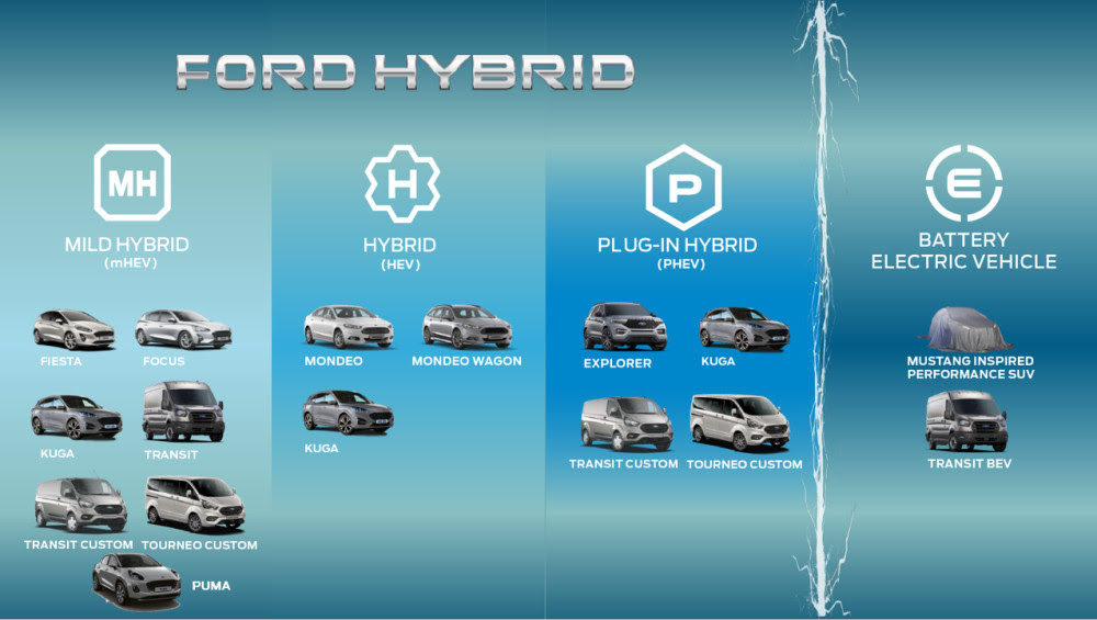 A Ford idei évre szóló hibrid és elektromos palettája. A mild hybrid modellek mellett 3 full hybrid, 4 plug-in hybrid és 2 tisztán elektromos modell is lesz