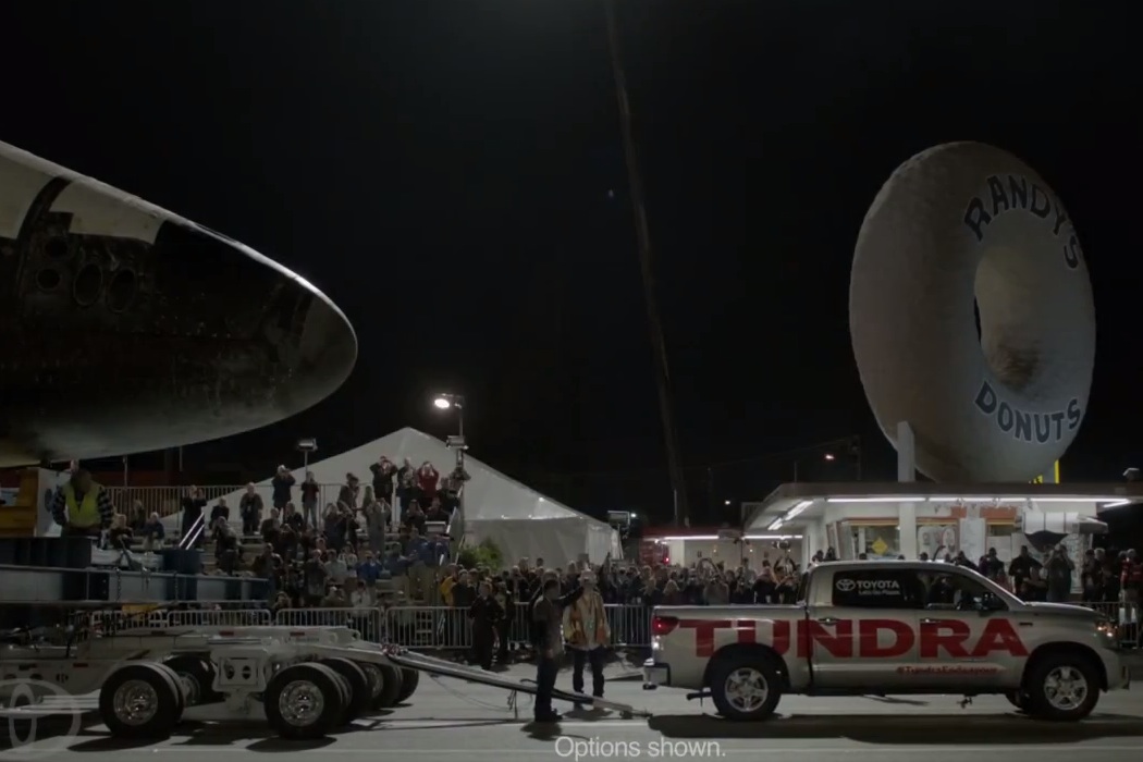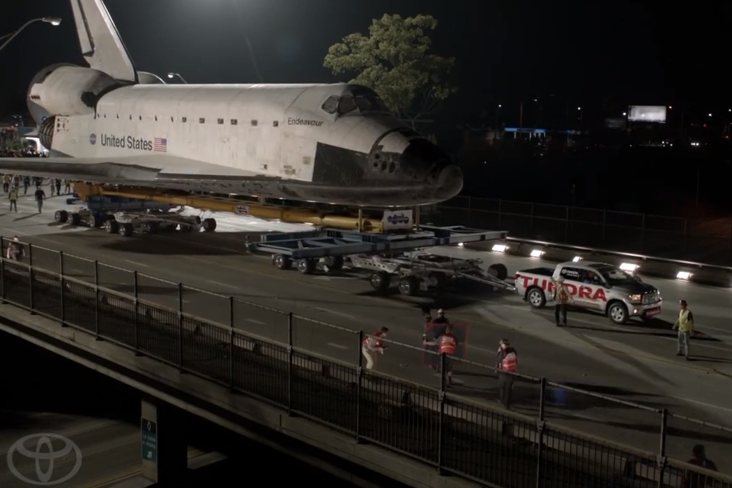 3 helyett 145 tonnát húzott a Toyota Tundra pickup, mikor szombaton átvontatta a Manchester Boulevard hídon az Endeavour űrrepülőgépet.