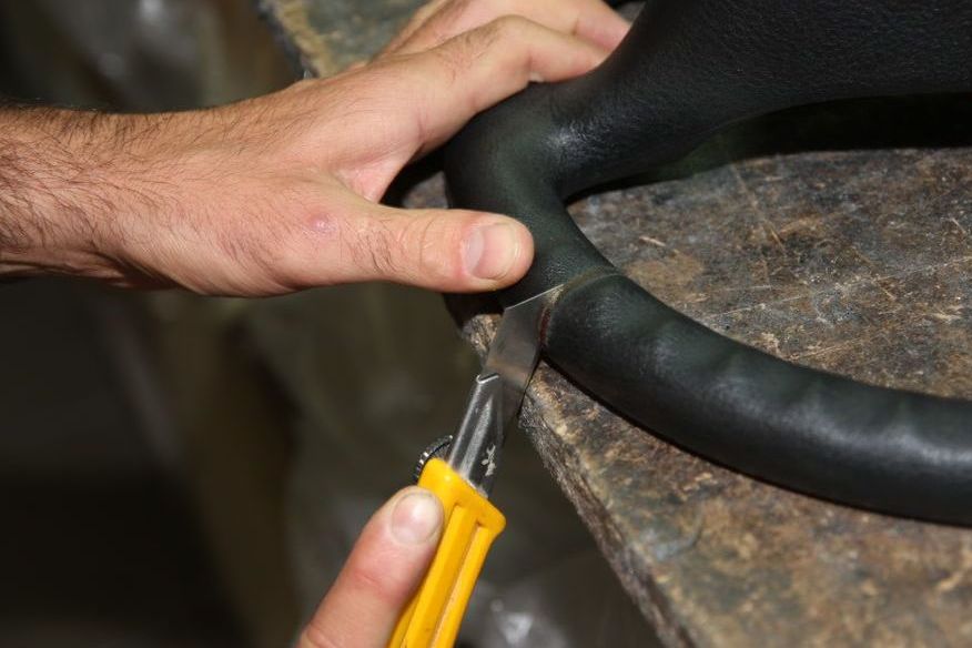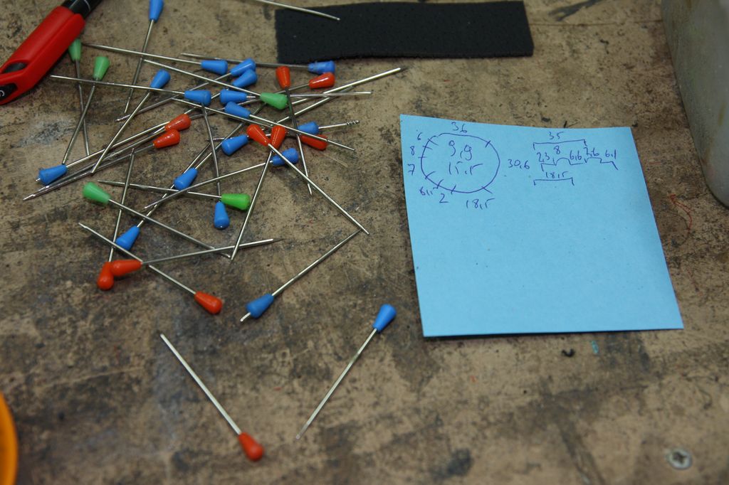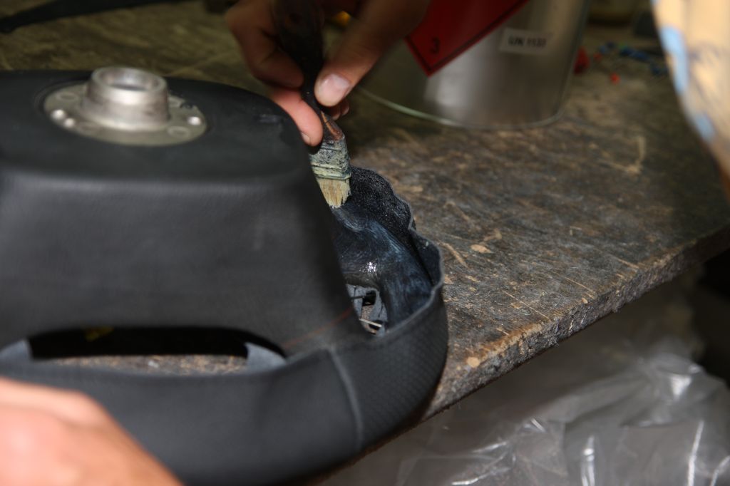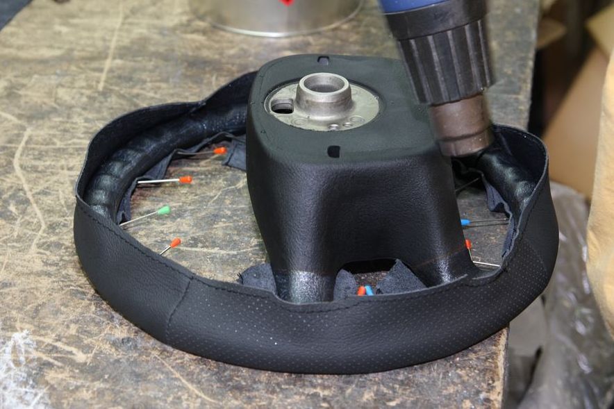 Kétségtelenül könnyebb a váltógomb bőrözése, mint a kormányé, két kisebb bőrt kell kivágni, azokat először gombostűvel rögzítve alak-formázni, felragasztani, végül összevarrni