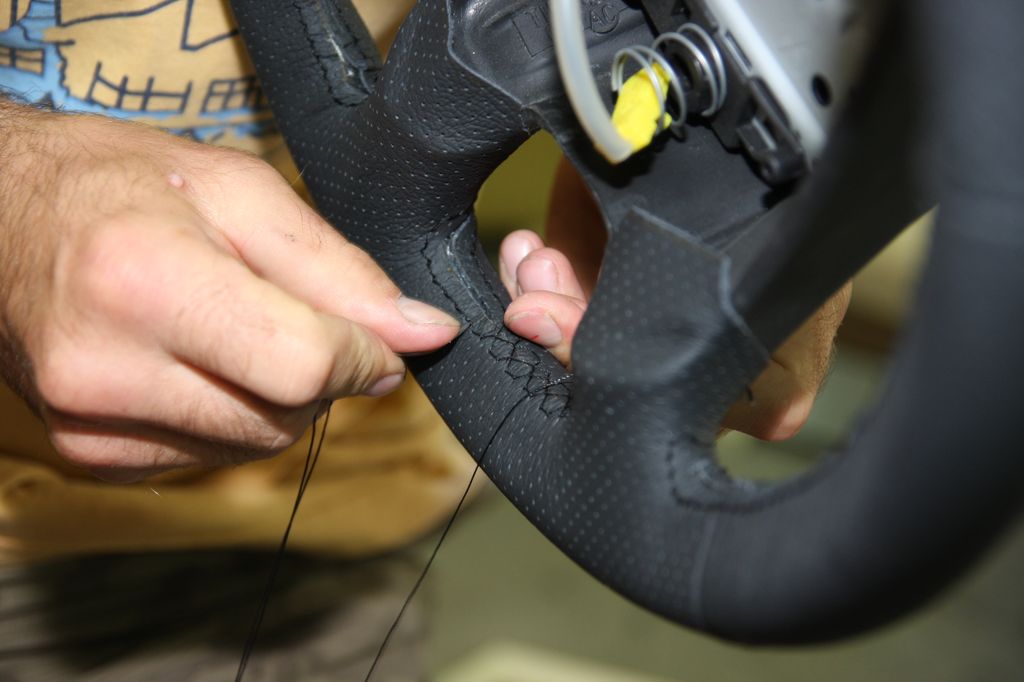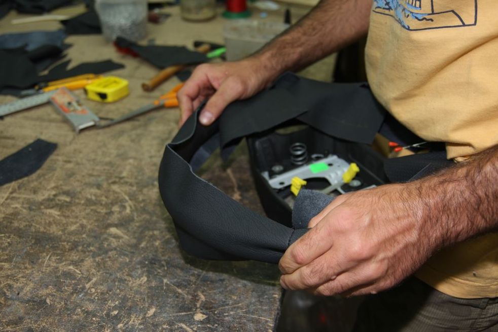 Ezen, itt még a varrógépen látható bőrdarabokból lesz a teljes kormányhuzat