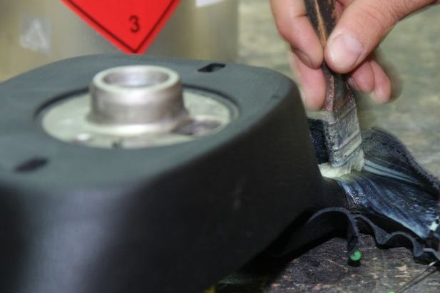 Huzatpróba még ragasztás előtt. Első körben gombostűkkel rögzítve ellenőrzik a kormányon, hogy jó lesz-e a kiszabott darab