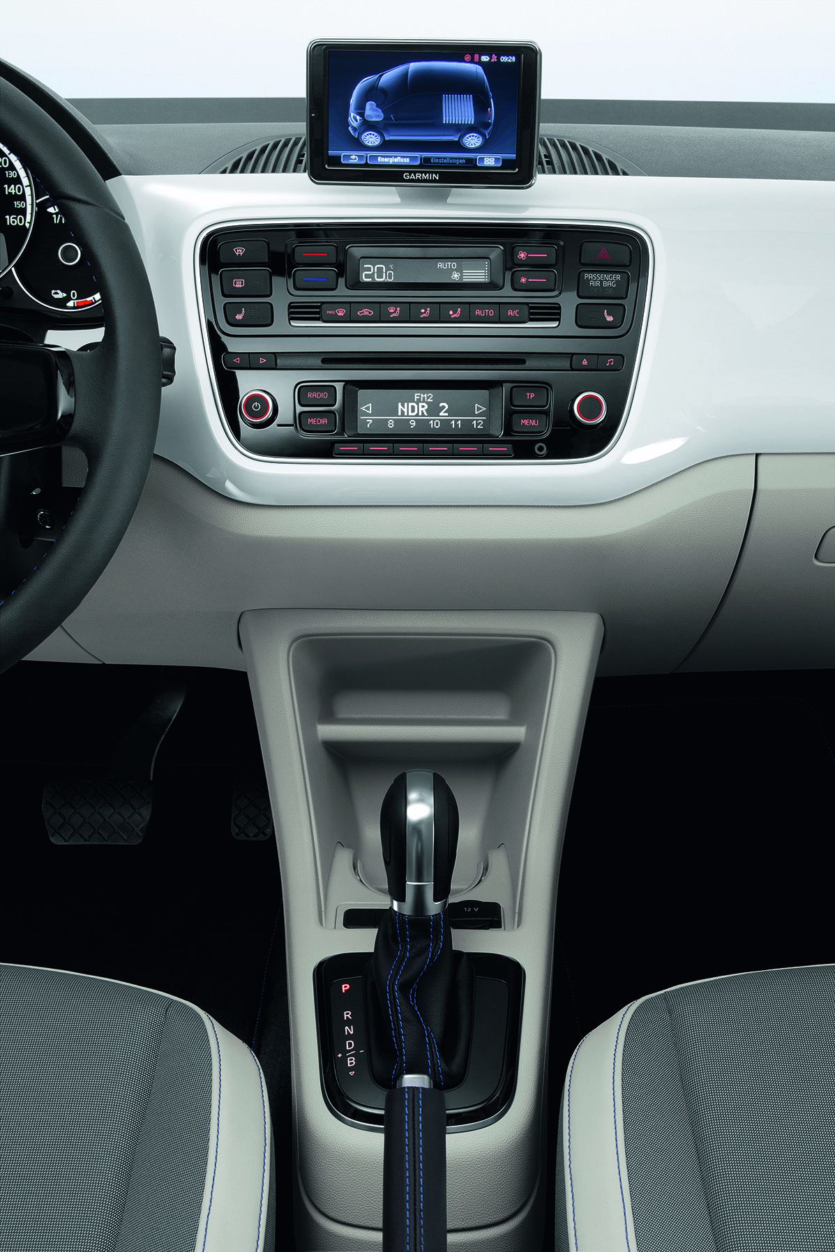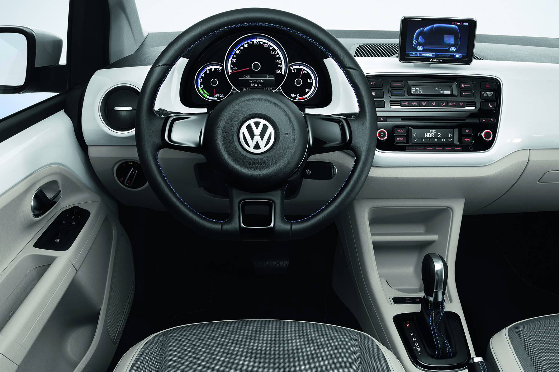 Lapított kormánykerék, automata váltót formáló irányváltó és dedikált kárpitok az e-up!-ban