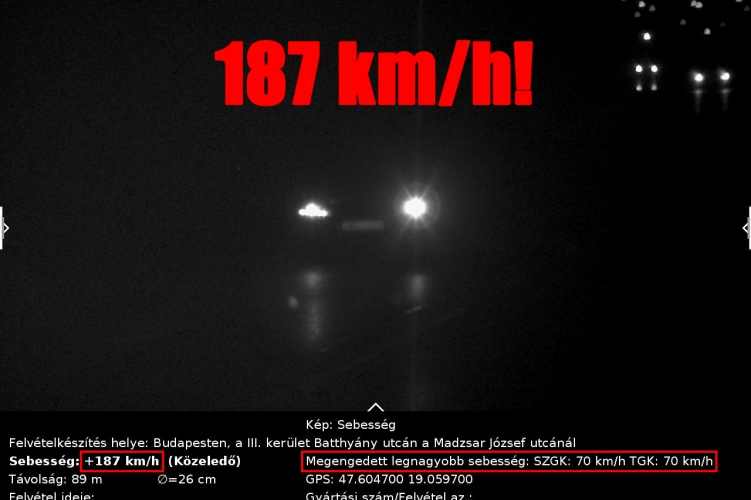 Általános tévhit, hogy a traffipaxok sötétben nem tudnak bizonyító erejű felvételt készíteni a gyorshajtás tényéről. Ezt már több, a rendőrség által nyilvánosságra hozott fotó is cáfolta. Nemrég újabb hasonló fényképet tettek közzé, amely még júniusban készült Budapesten, a III. kerületi Batthyány utcán. Az éjszakai órákban egy autós a megengedett 70 km/óra helyett 187 km/órával (!) húzott el a mérőműszer előtt. A rendőrség nem csak a hivatalos portálján, a közösségi médiában is megosztotta a felvételt. Utóbbihoz azt írták, közel félmillió forintos büntetéssel számolhat az elkövető. A hatályos jogszabályok értelmében a pontos összeg jó eséllyel 468 ezer forint, mivel jelenleg ez a legnagyobb kiszabható bírság gyorshajtás esetén.