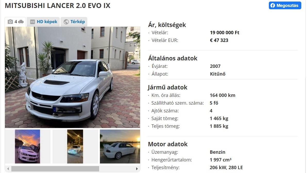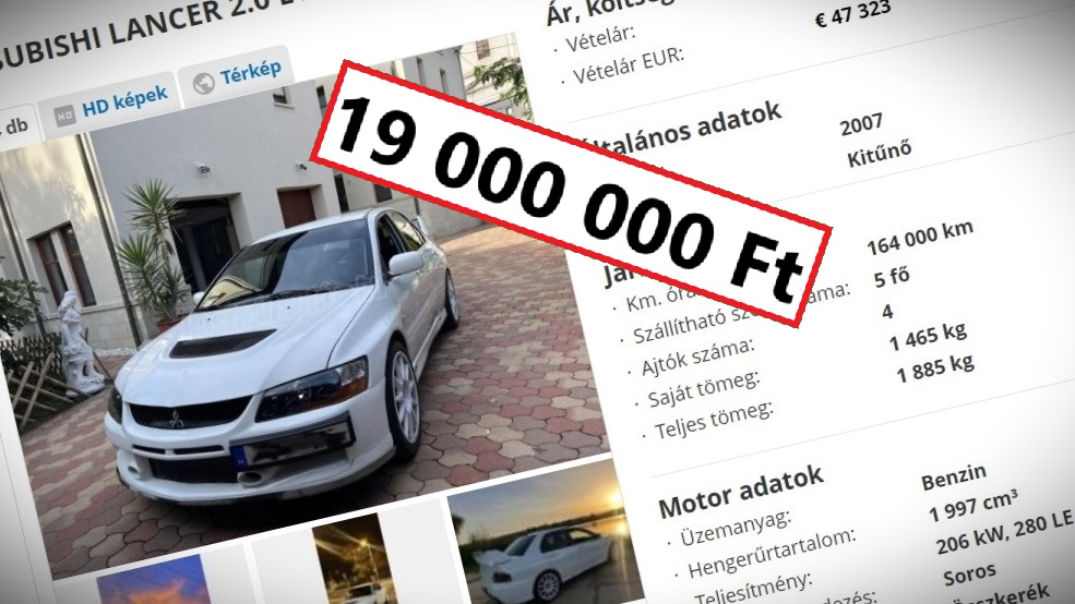 "igazi Evo modellnek", hiszen az már egy teljesen új motorral az orrában, a nyolcadik generációs Lancer alapjain látta meg a napvilágot, majd a megszokott egynéhány év helyett közel egy teljes évtizeden át gyártásban maradt. Ha így nézzük, akkor az utolsó, igazi, Stroker motoros Evo példányok egyike a hirdetés tárgya, a leírás alapján pedig nem elég, hogy kiváló állapotban maradt fenn a 164 ezer megtett kilométer során, még igényes, óvatos módosításokkal is felfrissítették az autót az utóbbi években. Te bevállalnád ennyiért ezt a legendát, vagy inkább a kék-sárga alternatíva láttán dobban meg a szíved? Várjuk a válaszokat a kommentmezőben!