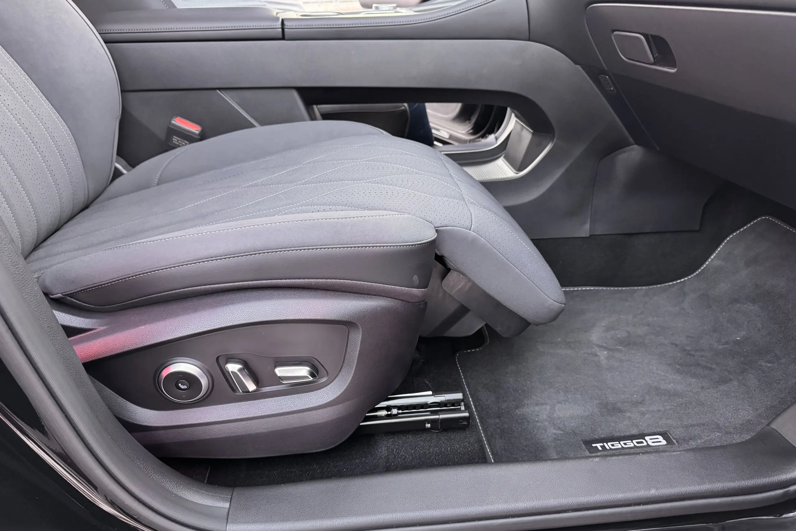 Motorizáltága teljesen ugyanaz, csupán a PHEV teljes hatótávolsága kevesebb egy kicsivel. A nagyobb tömeg és homlokfelület miatt "csak" 1150 kilométerben jelölték meg, de tisztán villanyhajtással ez is tudja a 90 kilométert. Ami jelentősen más az az utastér. A Tiggo8-asban még kellemesebb tapintásúak az anyagok és olyan ínyencségekkel is találkozhatunk, mint a fejtámlákba épített hangszórók, amelyekből egyébként itt 12 darabot ad a Sony. A multimédiás kijelző is nagyobb ugyanis 15,6 col am érete, míg a digitális műszeregység kisebb, csupán 10,25 colos. Viszont magasabb felszereltség esetén járnaka fűthető/hűthető első ülések és a fűthető hátsók, sőt még masszásfunkciós jobbegyes fotel is.
