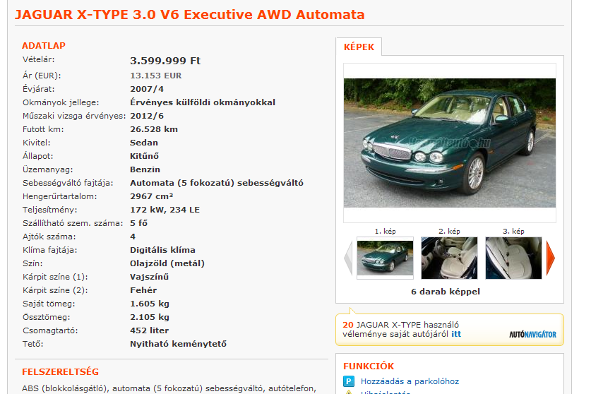 Viszonylag bőven lehet találni nagy teljesítményű, elfogadható árú, 5 évnél nem öregebb, legalább 200 lóerős használt autókat. A növekvő üzemanyagárak miatt egyre többen vásárolnak szerényebb étvágyúakat járgányokat, vélhetően ezért kerülhetett eladósorba a 26 ezer kilométert futott automata váltós, összkerékhajtású Jaguar X-Type is