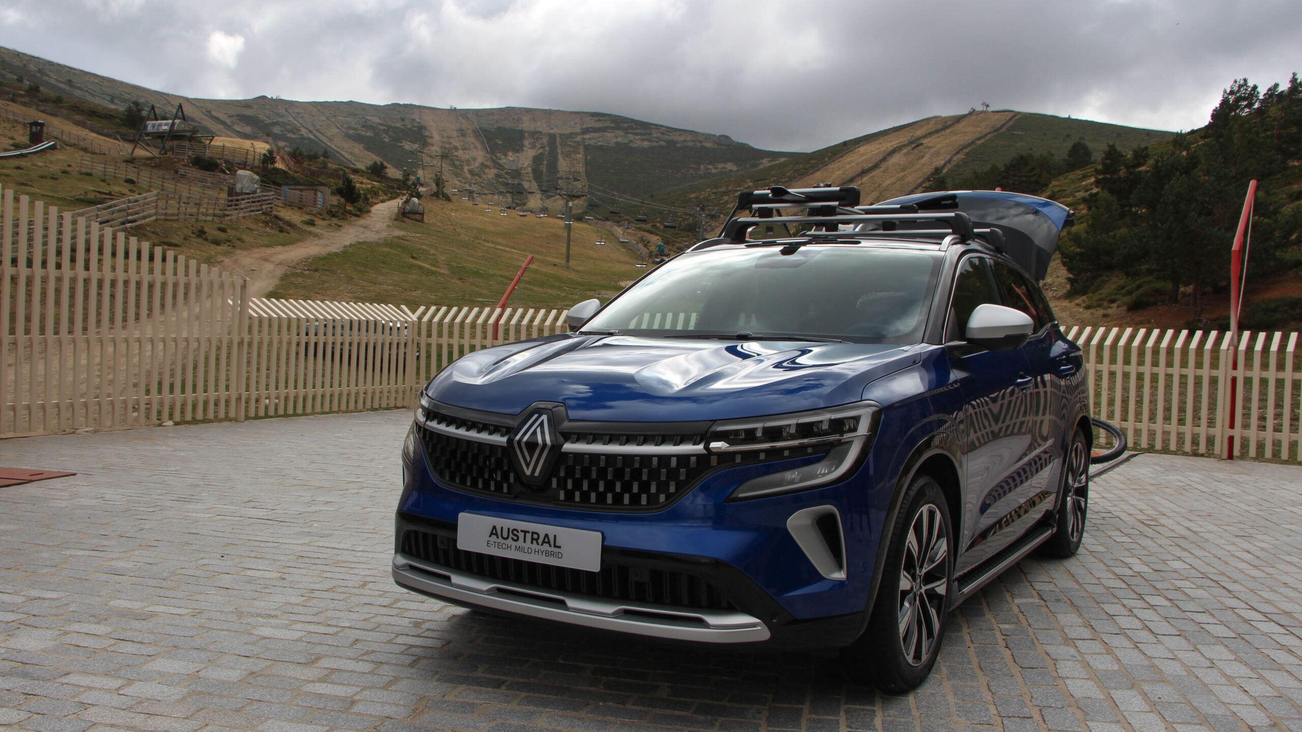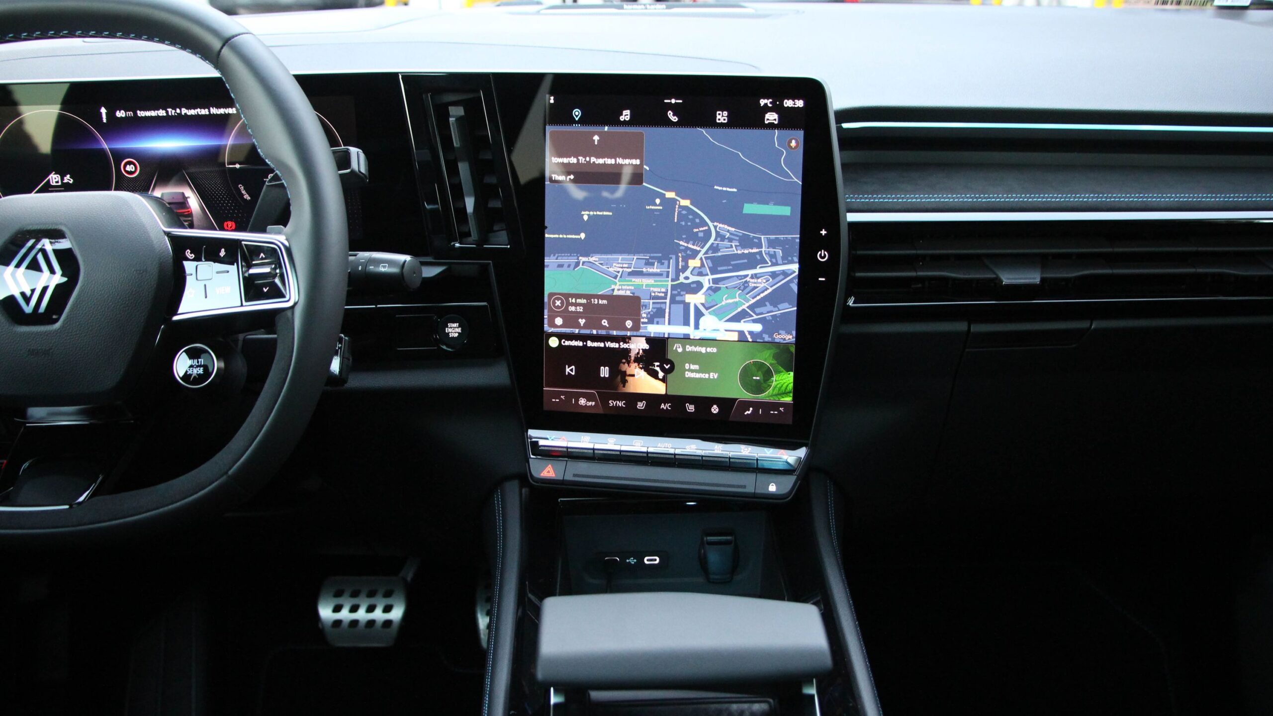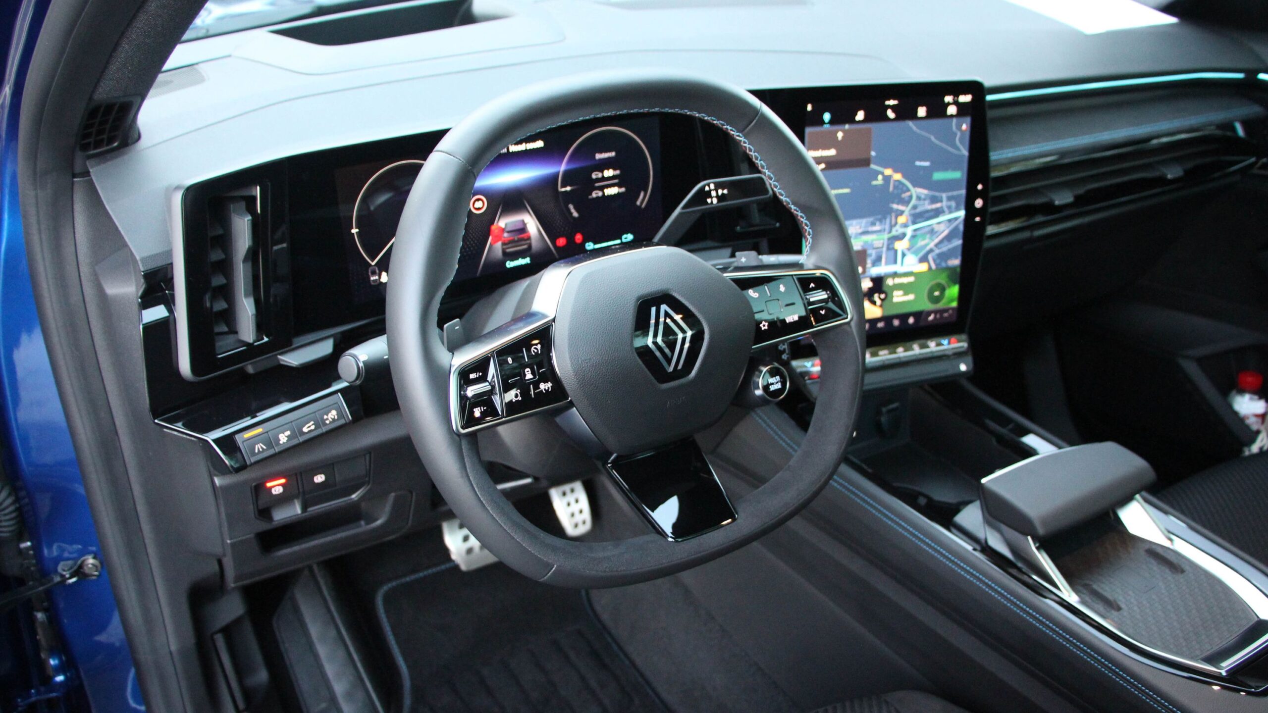 Bent is próbálták sportosra venni a figurát az Esprit Alpine kivitelnél, de szerencsére nem vitték túlzásba. Az Alcantara-szerű kárpitok, az A-betűs fejtámlák, az ülések kék varrása és francia lobogója mind-mind mind figyelmes megoldás. Sőt, a már-már négyszögletű kormánykerék burkolatának varrása is a francia nemzeti színekből áll. Az ülések enyhén emlékeztetnek elöl a sportülésekre, de azért nem adnak olyan jó oldaltartást tempósabb kanyaroknál, de mindjárt rátérek arra is, hogy a sportos megjelenés ellenére nem is ez az Austral rendeltetése. A műszerfalon a vezető előtti műszeregység mindenképp 12 colos, míg az érintőképernyő 9-12 colos lehet felszereltségtől függően. Az infotainment rendszer a Google operációs rendszerét használja. Gyors, szép a grafikája, de egy kis gyakorlást igényel a menürendszer kezelése. A kardánalagúton pedig látványos kapaszkodó trónol, alatta a vezeték nélküli telefontöltővel és egy tárolórekesszel.