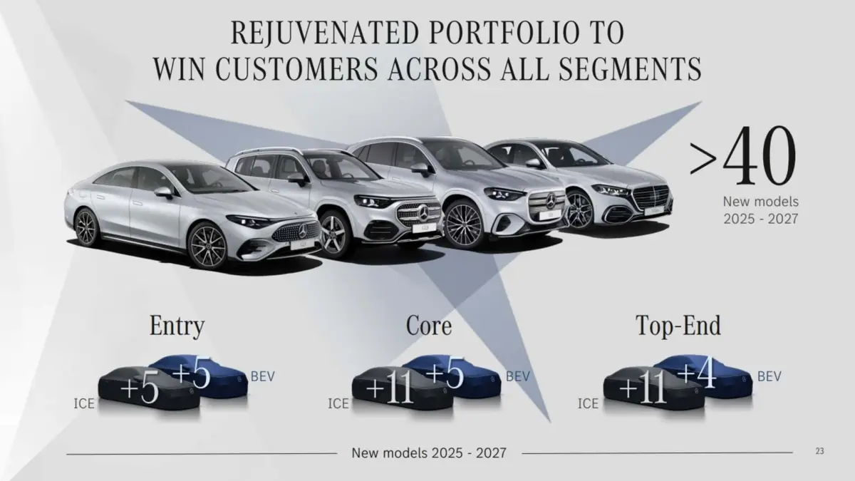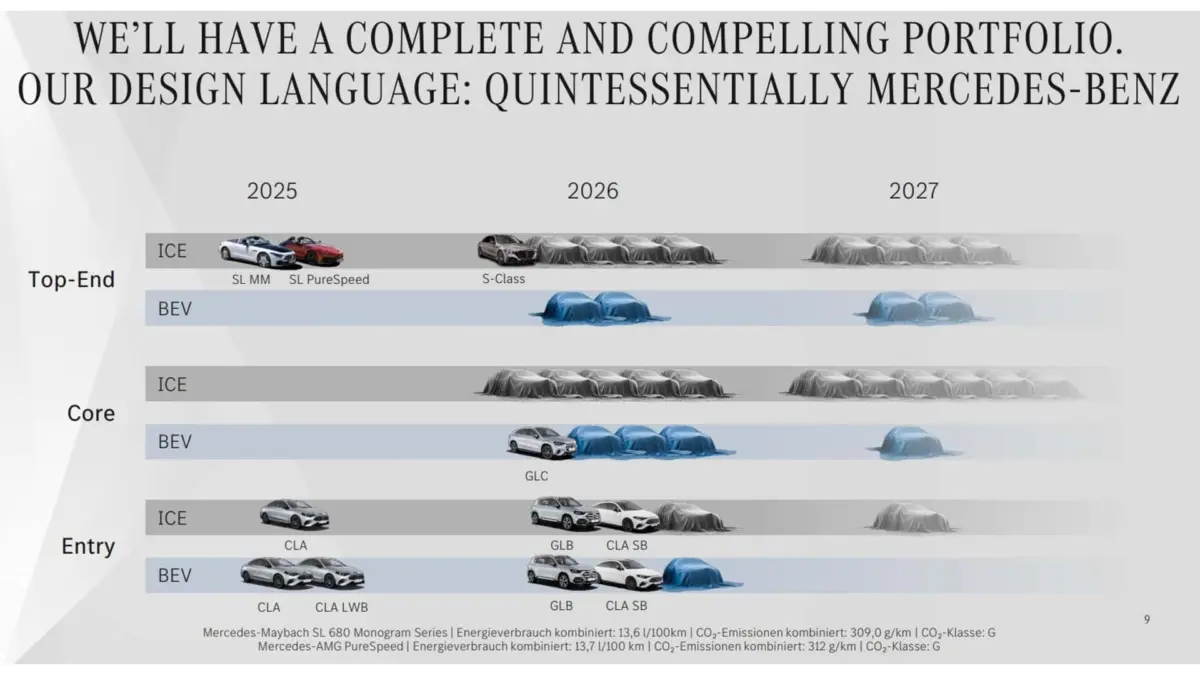 Csütörtökön tartotta a Mercedes az éves pénzügyi beszámolóját, amelyen természetesen a közeljövőről is szót ejtettek. Ezzel kapcsolatban a prezentációban egy olyan dia is felvillant, amelyen hét letakart autó látható, fölötte pedig az ígéret, hogy mindezt három hónapon belül bemutatják. Bár egyelőre hivatalosan nem erősítették meg egyik típus "kilétét" sem, azért a korábbi információk és a sziluettek alapján egész pontos tippeket lehet megfogalmazni. Mindjárt a kép bal szélén egy buszlimuzin szerű gépkocsi lapul, amely jó eséllyel a VLE lesz, ráadásul időben is stimmel, hiszen a legfeljebb 8 személyes modell világpremierjét már korábban kitűzték: március 10-ére. Továbbá az is biztosnak tűnik, hogy a fennmaradó 6 modell közül valamelyik az elektromos C-osztály. Ennek gyártási helyszíne Kecskemét lesz, a termelés pedig a korábban nyilvánosságra került információk szerint még a második negyedévben elindul, vagyis addigra jó eséllyel be fogják mutatni. A mostani modelloffenzíva csupán a kezdet: 2025 és 2027 között több mint 40 modellt leplez le a Mercedes. Ebből a belépő szinten 5 belső égésű motorosat és 5 tisztán elektromosat, a "Core" termékcsaládba 11 "hagyományos" hajtásláncú és 5 villanyos érkezik, míg a "Top-End", vagy luxus kategória 11 belső égésű motoros és 4 EV modellel bővül.