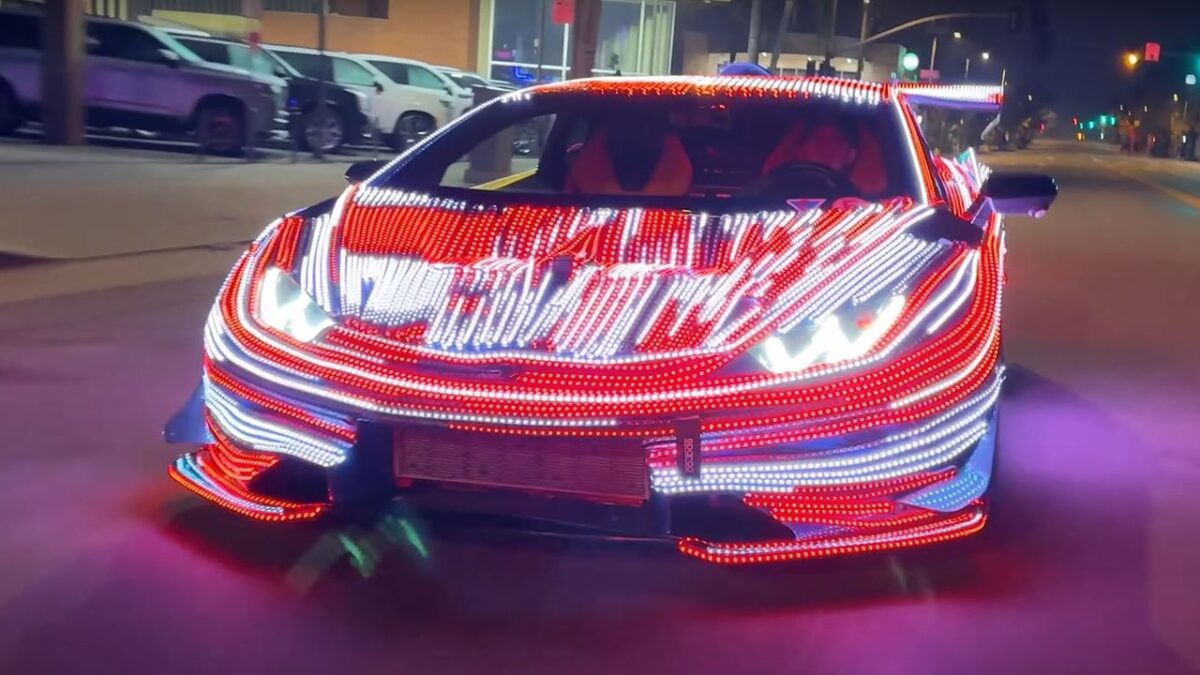 Valóságos guruló fényfüzérré változtatta egy amerikai autós tartalomkészítő a Lamborghini Huracánját, amely nemcsak egyetlen színben képes világítani, de menet közben dinamikusan változtatja a színeket.