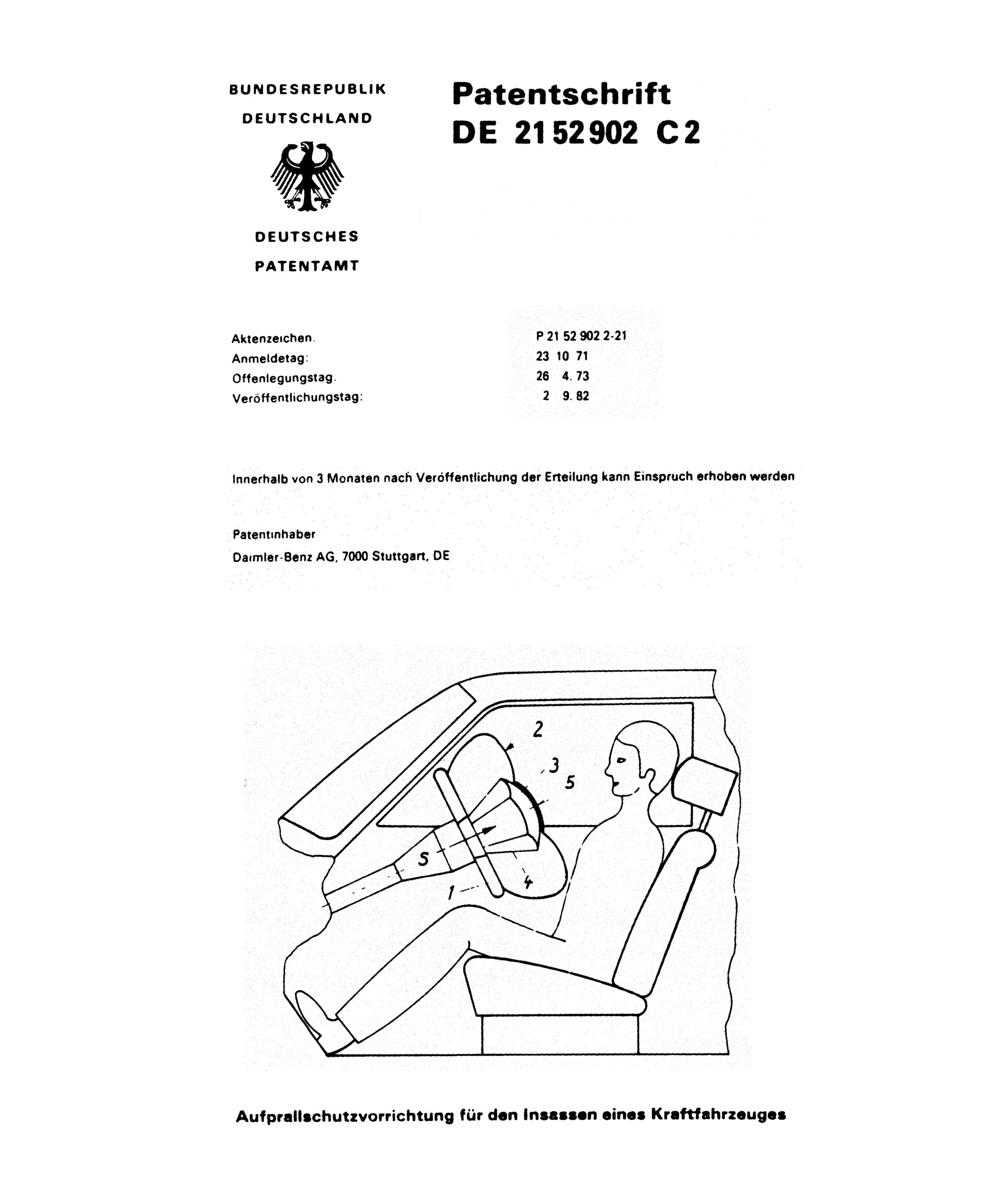 Érdekes, hogy időben mennyire közel nyújtották be az első légzsák szabadalmakat Európában és Amerikában egyaránt. Az elsőség azonban a német Walter Linderer nevéhez fűződik, aki 1951. október 6-án járult a német szabadalmi hivatal elé találmányával, amely a járműben ülő személyek ütközéskori sérülései ellen nyújtott védelmet. Az ő légzsák ötlete is azon alapult, hogy a szerkezet összecsukott állapotban várakozik, majd, amikor szükséges, sűrített levegő felfújja. A müncheni feltaláló ötlete tényleg zseniális volt, de egyszerűen nem létezett még az a technika, amely kellő gyorsasággal képes felfújni a légzsákot, illetve olyan érzékelő sem létezett, ami biztosítja az ütközéskor elvárt gyorsaságot. Sőt, még az az erős, szakadásálló műanyag sem létezett, amiből manapság a légzsákok készülnek. Aztán a Mercedes mérnökei 1966-ban vették elő újra az ötletet, majd 1967-ben már elkezdtek kísérletezni a felfújással. Az új ütközésvédelmi eszköz szabadalmát ők 1971-ben nyújtották be.