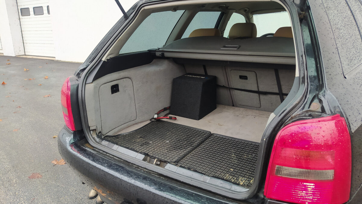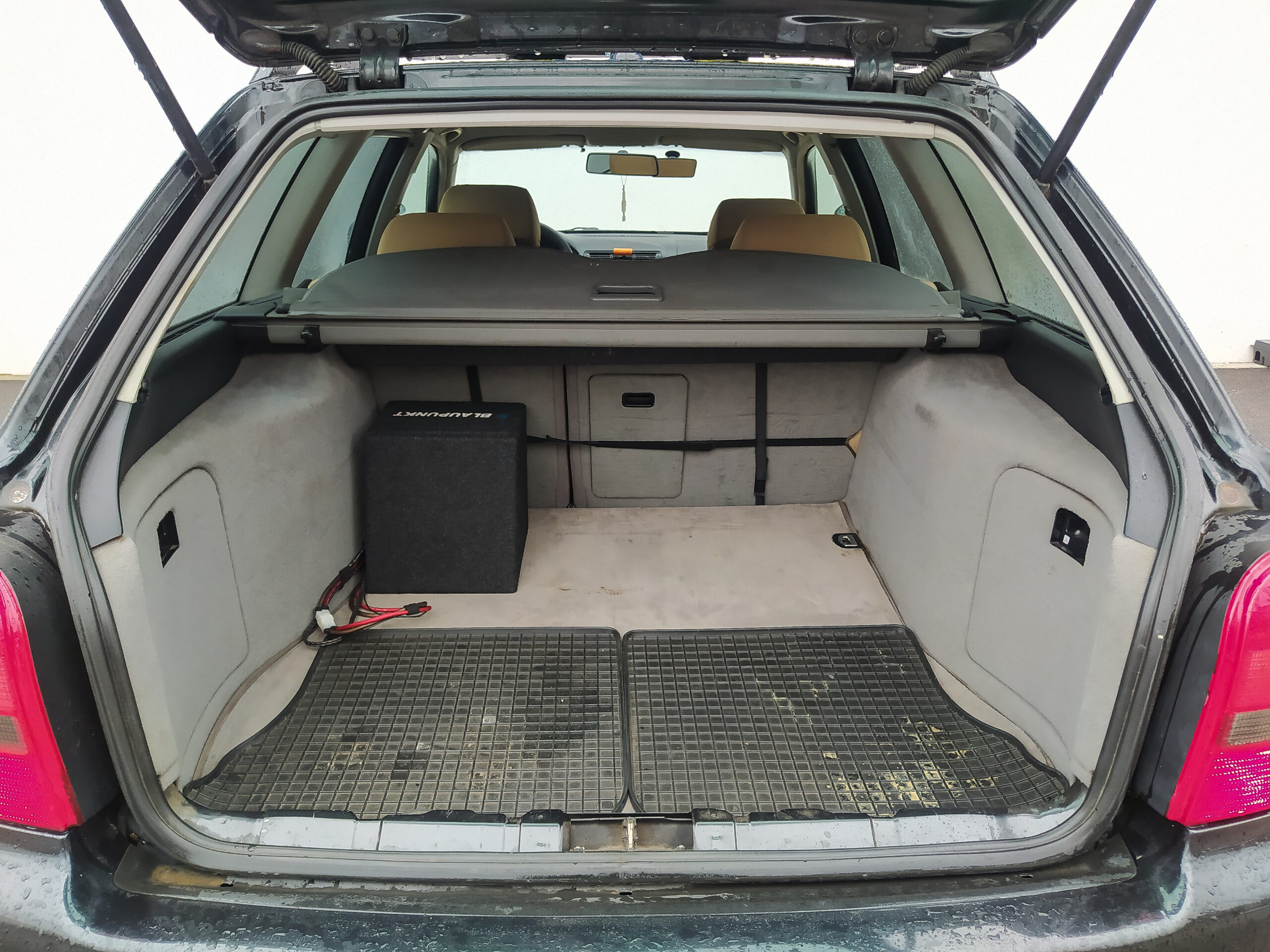 Ezért mondjuk mindent el is követ a tulaj, méretpontos üléshuzatok védik a világosszürke foteleket mindkét sorban, amelyek meglepően kényelmesek, ám sajnos az eredeti Audi kárpitok anyagminőségét nem érik el. Elöl kategóriájában kiváló a helykínálat, míg hátul azért érezhetően szűkös, főleg széltében. Mondjuk egy negyedik generációs Golfnál tágasabb, ám az ötödik már bőségesen megelőzi. A csomagtartó is leginkább csak jól pakolható - hiszen egy kombiról beszélünk - ám papíron csak 390 literes. Ebből esetünkben egy utólagos, Blaupunkt mélyláda is foglal egy keveset, ami azért meglepő, mert az autó gyárilag 6 hangszóróval és a plüss csomagtér-burkolat mögé rejtett mélysugárzóval szerelt. Ez a gyári hangrendszer azonban csak a gyári fejegységgel, vagy kimondottan ehhez a szetthez készült adapterrel működik, így az utángyártott rádióval mindössze a két első ajtókárpit szólal meg. A legtöbben ilyenkor - mivel nem is sejtik, hogy mi lapul a burkolat mögött - a képeken látható módon oldják meg a problémát.