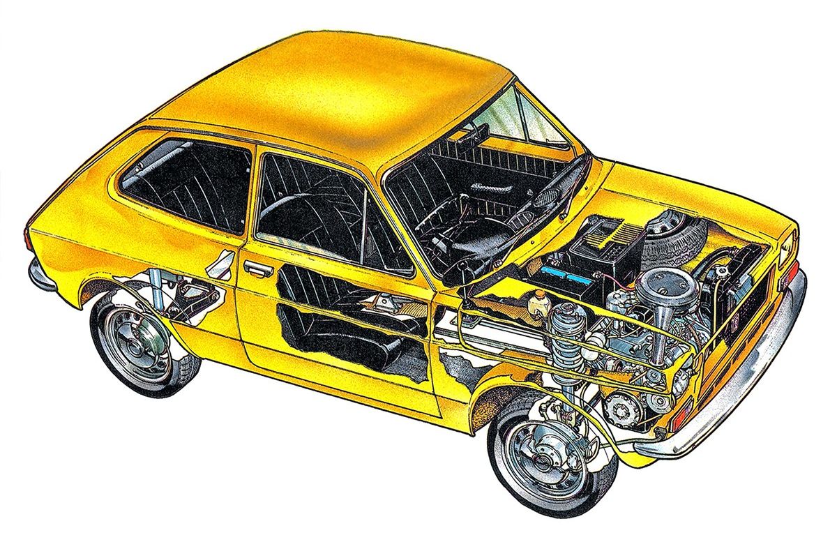 Persze fejlesztése már az 1960-as években elindult. Pontosabban a lemezek alatt rejlő technika fejlesztése, hiszen a 850-es utódjának szánt modell műszaki megoldásait az Autobianchi autóiban tesztelték. Nem is csak szimplán tesztelték, piacra is dobták őket, így élesben bizonyíthatott a konstrukció. A manapság már megszokott technika, ami a keresztben beépített orrmotort és az elsőkerék-meghajtást jelenti. Ezt a megoldást a Fiat főmérnöke a Minitől leste el, majd sikeresen meggyőzte a vezetőséget, hogy érdemes ilyen autót a piacra dobniuk. Viszont, ahogy említettem, először az Autobianchi embléma alatt debütált a Primulában. Természetesen nem egy az egyben a britektől emelték át a technikát, módosítottak néhány részleten, például a váltó nem a motorral közös olajteknőt kapott, ami több előnyös tulajdonság mellett a szervizelést is megkönnyítette.