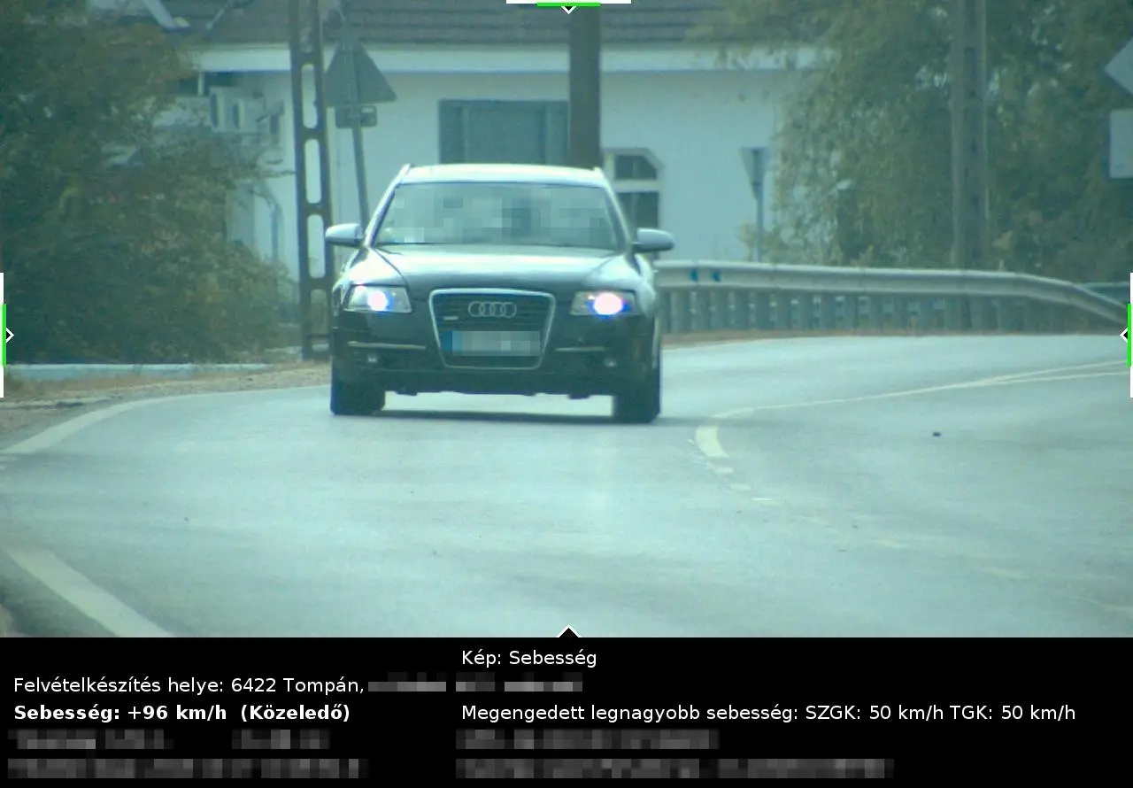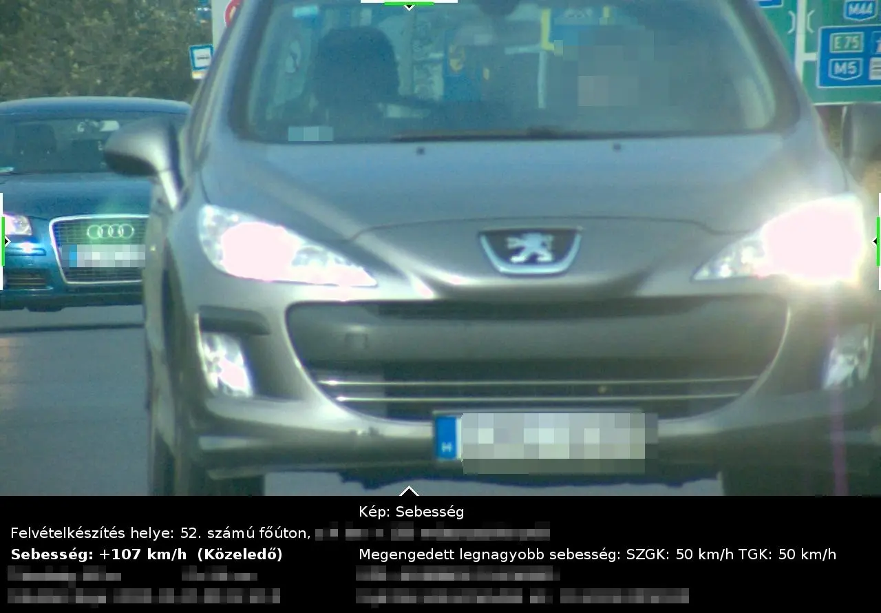 Az 50 helyett 107 km/órával bemért Peugeot, illetve az 50 helyett 109 km/órával lefotózott BMW üzemben tartói már húzósabb, 210 ezer forintos bírságra számíthatnak a postaládájukban, ám még ez sem minden. Múlt héten ugyanis a kiszabható maximális, 468 ezer forintos bírságot is sikerült kiosztani, egy 50 helyett 131 km/órával, ráadásul telepített traffipax alatt száguldozó sofőrnek.