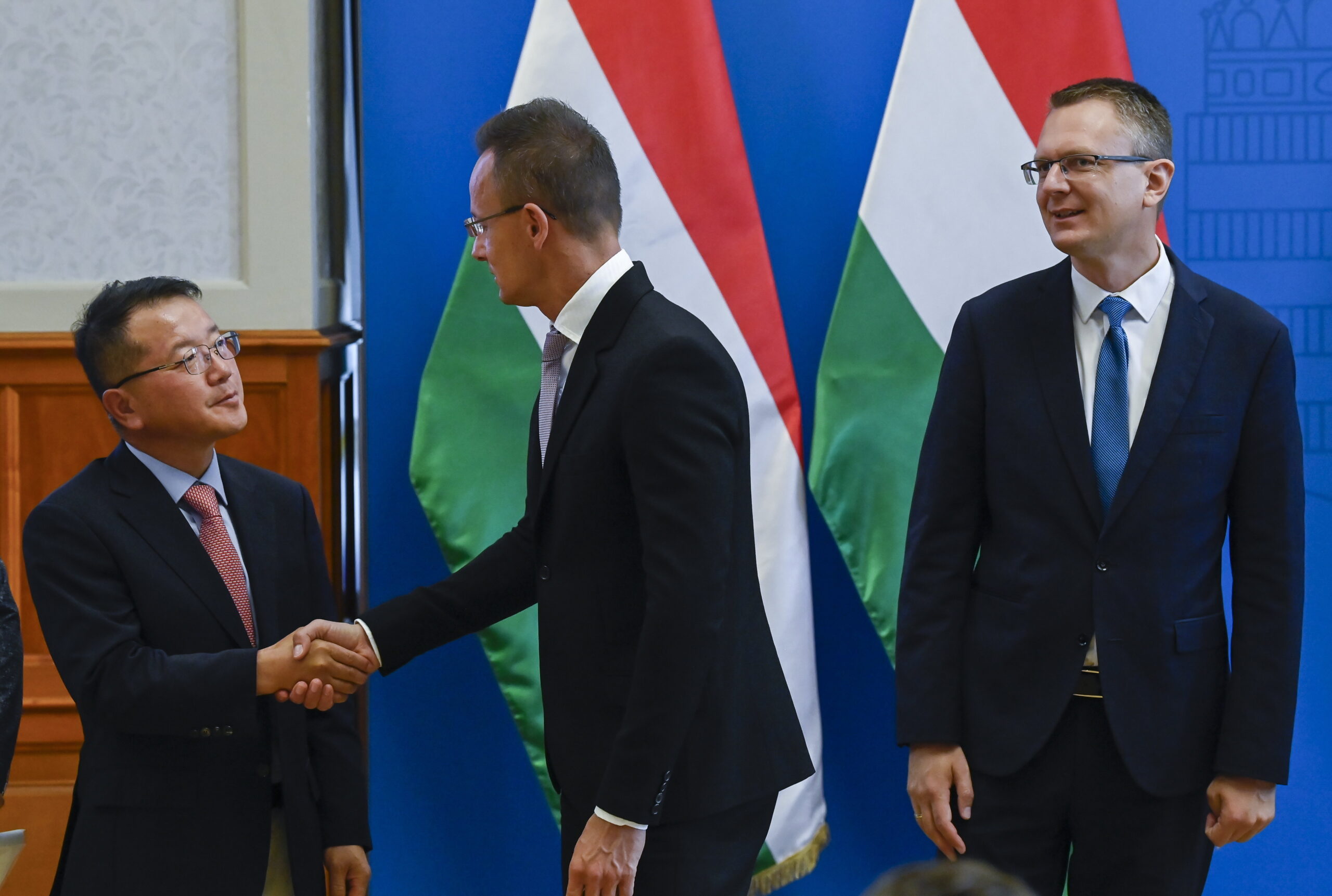 Balról jobbra Park Chang Sik, a Nice LMS Hungary Kft. vezérigazgatója, Szijjártó Péter külgazdasági és külügyminiszer, valamint étvári Bence, a Belügyminisztérium parlamenti államtitkára, Vác országgyűlési képviselője (Fotó: MTI)