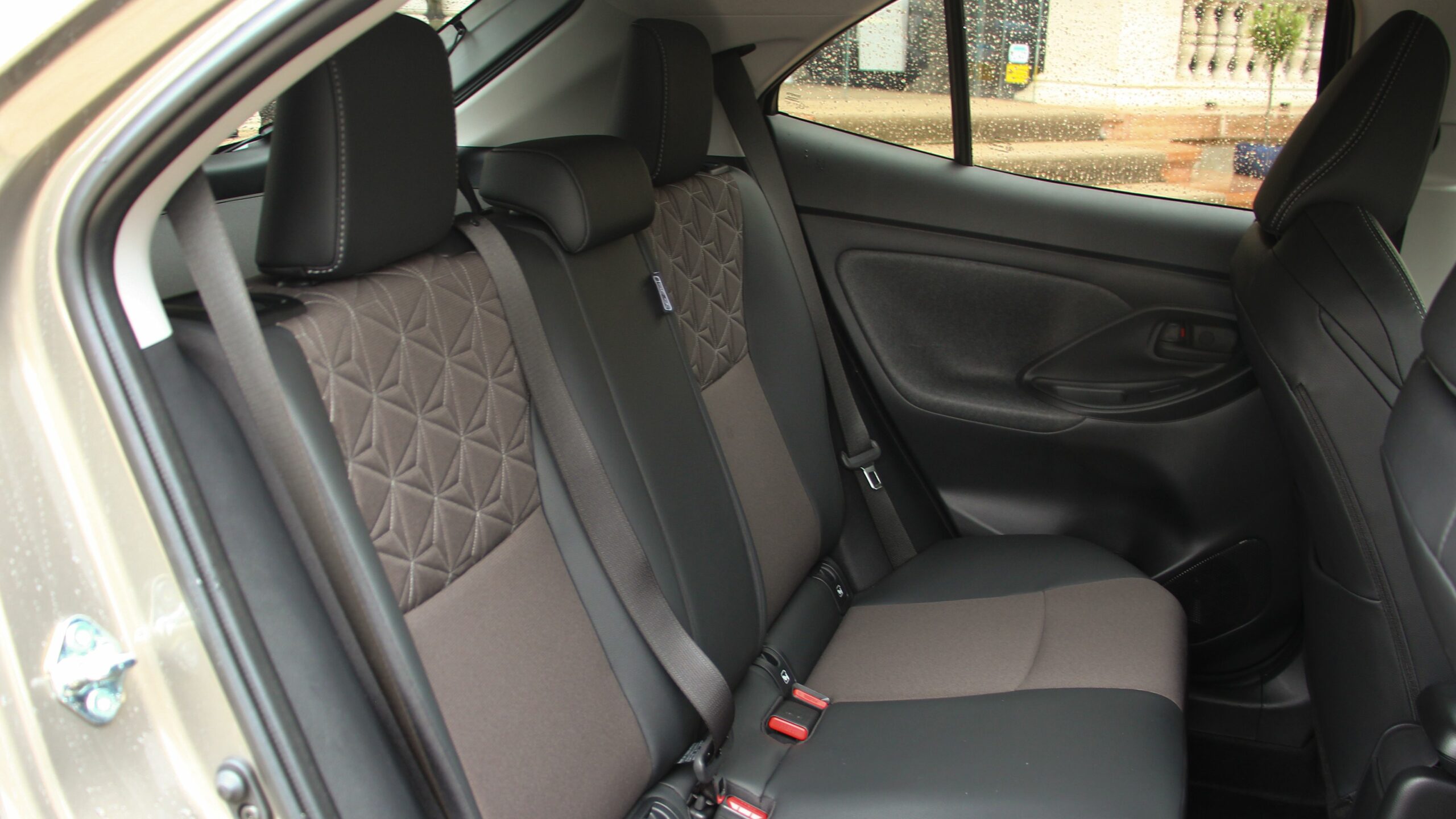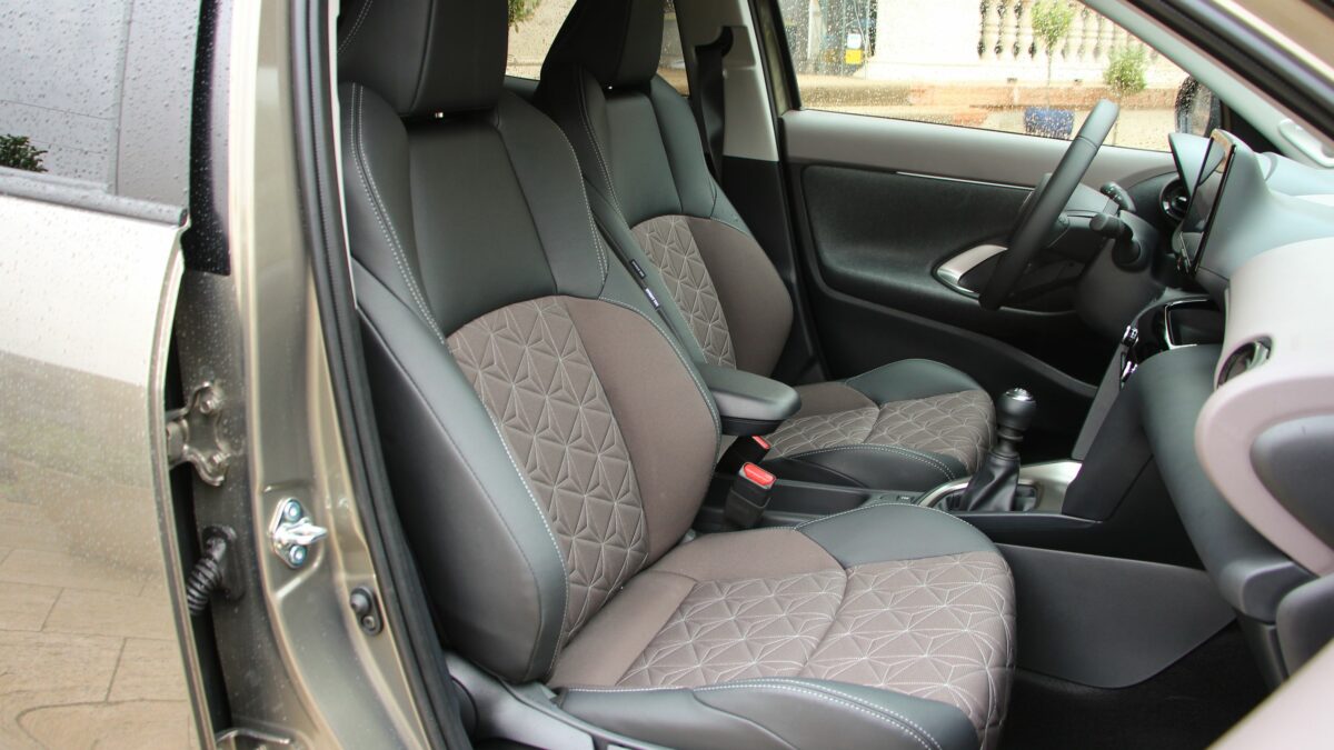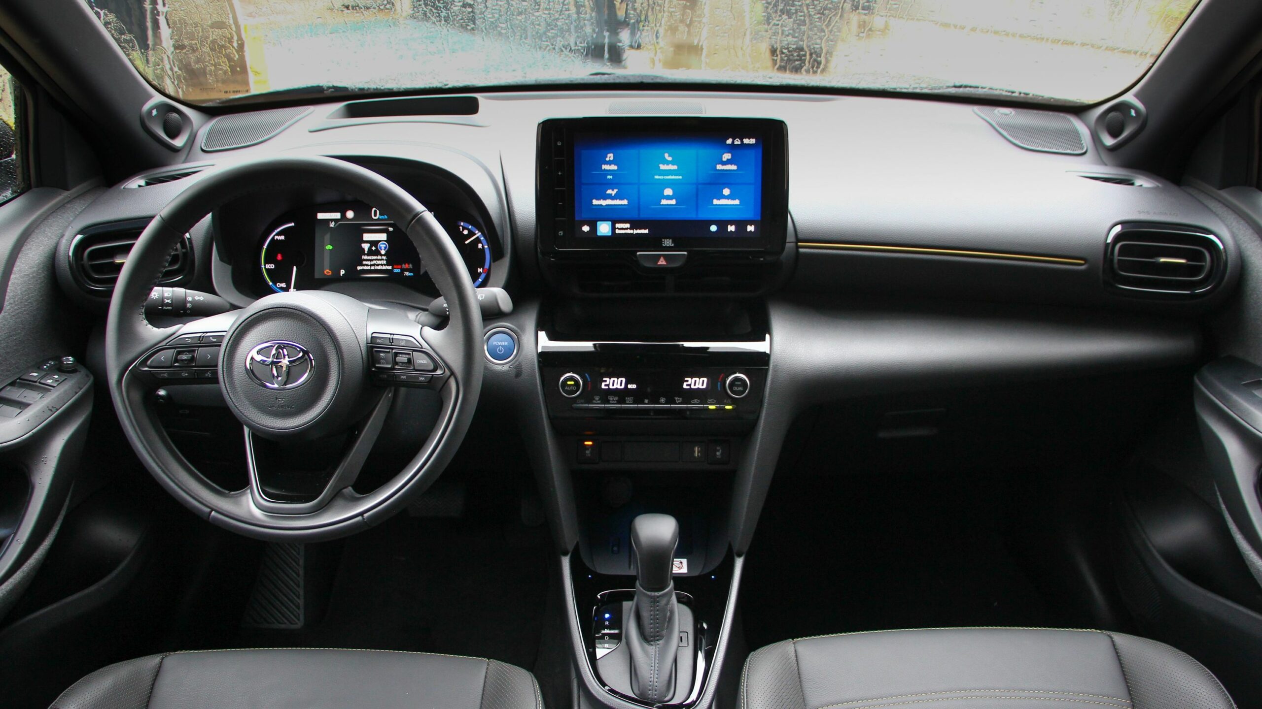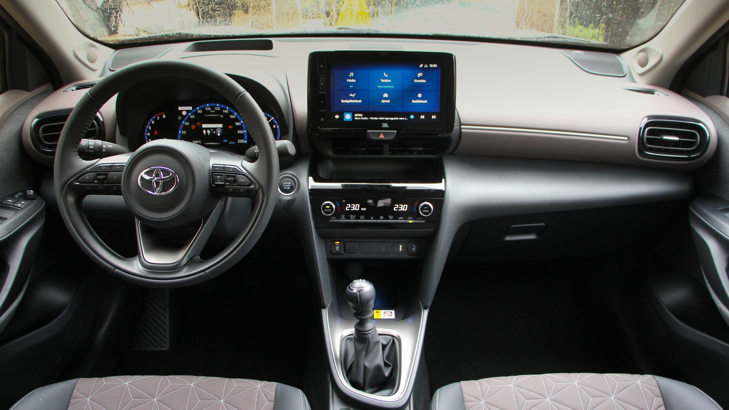 Bent már más a helyzet, itt egyértelműen egy Yarist kapunk. A kormánykerék és az ajtóburkolatok egy az egyben onnan ismerősek, de azért más a középkonzol, eltérő az érintőképernyős kijelző és a digitális műszeregység. Viszont a tengelytávolsága megegyezik a sima Yariséval, 2560 mm-es, de mégis hosszabb a Cross 240 mm-rel. Első túlnyúlása 60, hátsó túlnyúlása pedig 180 mm-rel jelentősebb, szóval a beltere nagyobb, amit már az első pillanatban érezni lehetett a hátsó helyekre behuppanva. A hasmagasság egyébként 30 millimétert nőtt, és a karosszéria is 90 mm-rel magasabb, illetve 20 mm-rel szélesebb a Yarishoz képest.