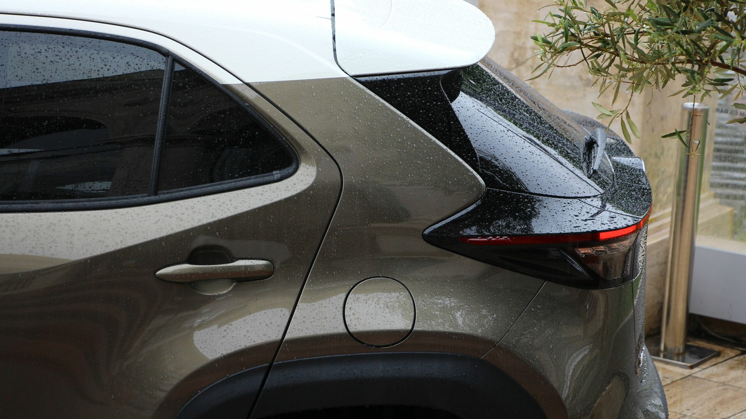 Ismét fülembe csengenek Toyoda úr szavai, amely szerint a Toyota többé nem fog unalmas autókat gyártani. A Yaris Cross pedig tökéletesen igazodik ehhez a tézishez, legalábbis a formatervével biztosan. Pedig ebben a szegmensben nem árt óvatosnak lenni, ha széles vásárlóközönség ízlését szeretnék lefedni. A sima Yaris formaterve jól sikerült, csinos, csábító. Ugyanez elmondható a Cross változatról is, miközben formailag azért önálló karakter. Kívül mindenképp. Markáns műanyag elemek határolják a sárvédőket, illetve az alsó légbeömlőt is körbeölelik. Habár a zuhogó eső miatt kevésbé látszik a képeken, az autó oldalán is érdekes fény-árnyék vonalak futnak, illetve a műanyag dísz innen sem maradt le, benne a Yaris Cross felirattal. Nagyon szépen rajzolták meg a C-oszlopot is, míg hátul szintén egyedi lett a Cross, nem feltétlenül a Yarist juttatja eszünkbe. Sokkal inkább a Lexus UX ugrik be róla, ami jót tesz a presztízsének.