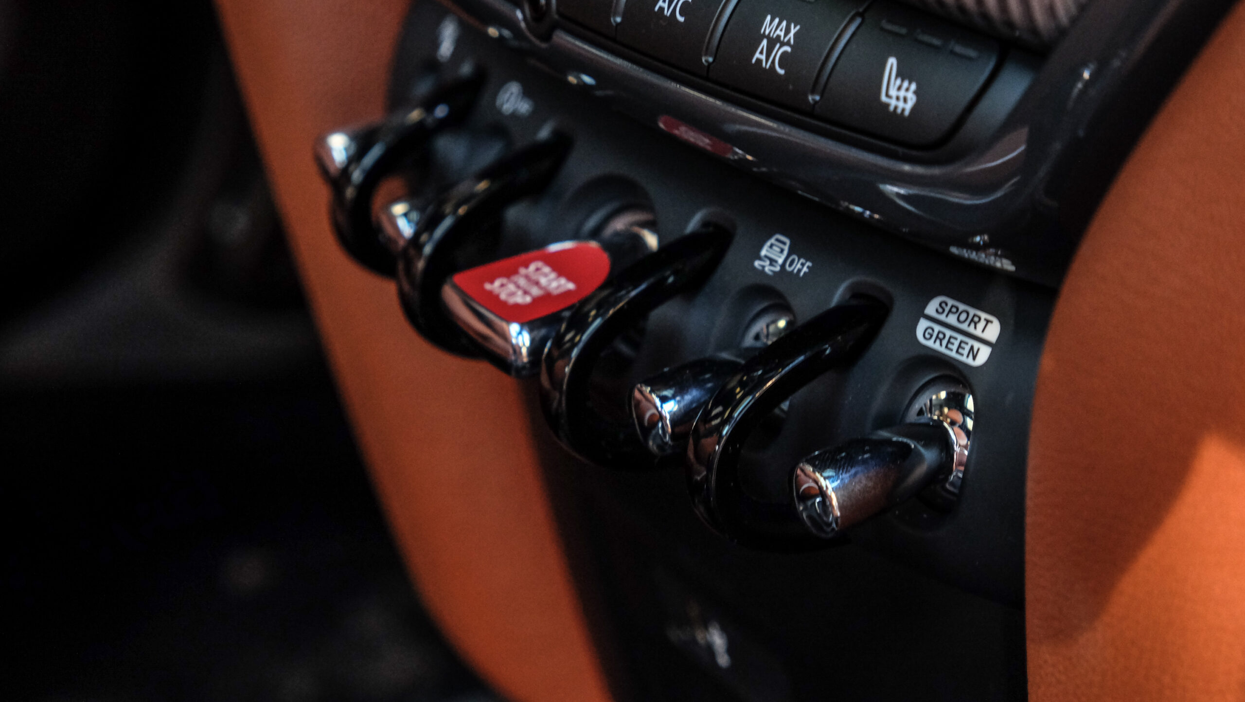 2. Egyedi és minőségi belül is. Formája az első, ami megragadja az embert, és ez belül is igaz. Semmihez nem hasonlítható, egyetlen pontján sem találunk azonosságot más modellekkel. Erre lehet azt mondani teljes joggal, hogy egyedi. Barátságosan otthonosak a formák, a kerekded idomok az üléseken, fejtámlákon, ajtókárpitokon is visszaköszönnek, van benne érdekesség, és van benne harmónia is. Ilyen billenőkapcsolókat évtizedekkel az új MINI előtt láttunk utoljára és annak 20 éve alatt sem jött vissza egyetlen márkánál sem. Pici ívek szeparálják el őket egymástól, az ajtókárpitokba, lábtérbe, tetőkárpitba díszvilágítás kerülhet, és ennek árnyalatát is egy ilyen billenőkapcsolóval állíthatjuk a plafonról. A gyakorlott minisek már tudják, hová nyúljanak érte, ez is egy olyan pont, amit más nem használ, menüből színt állítani már olyan kommersz, pláne, hogy már szinte minden autóba lehet rendelni. Anyagaiban pont olyan, mint a háromajtós, néhány területen még jobb és részletgazdagabb is. Hogy a csomagtartó padlójából kényelmes pad hajtható ki, szintén a Countryman egyedi megoldása, és fergeteges!