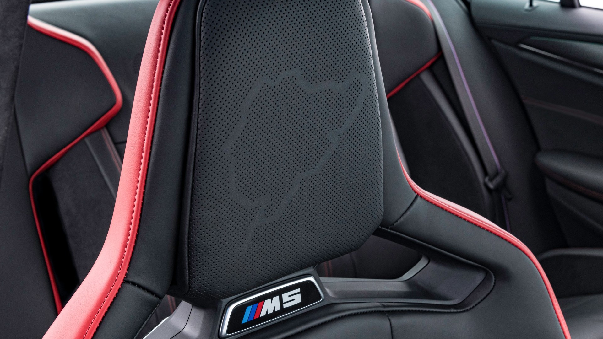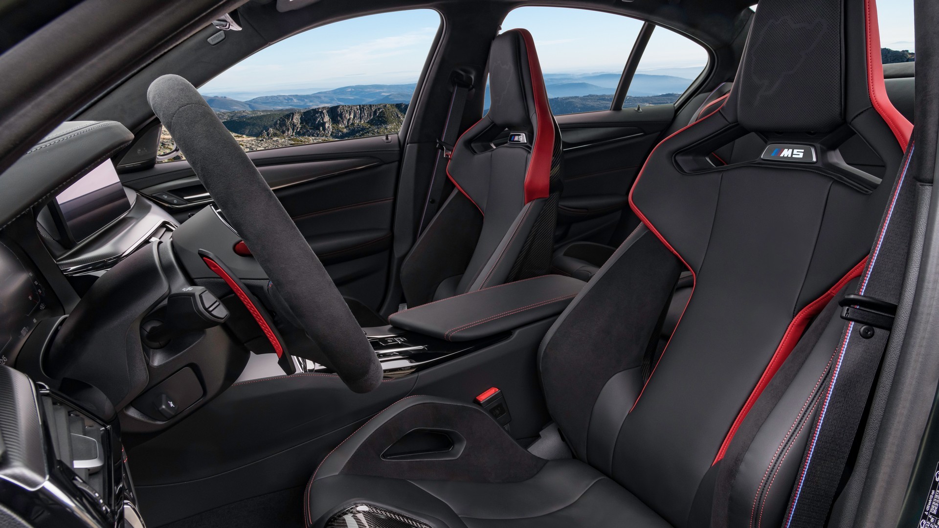 Stílusában a beltér is elég sokat változott, az M5 és M5 Competitionhöz képest sokat veszített a luxusautós hangulatból. M-es sportkormányát Alcantara huzattal vonták be, ebből készült a tetőkárpit borítása is, valamint a kormányra karbonszálas váltófülek kerültek, az eredetieknél nagyobb méretben. Változtak az ülések is, az új M4-ben bemutatkozott karbonvázú sportülések kerültek előre, hátul pedig csupán két utasnak jut hely, nekik is tökéletesen formázott kagylóülésekben. Az ülések fejtámláján a Nürburgring Nordschleife nyomvonalát láthatjuk, ezzel is utalva arra, hogy a BMW mennyi időt tölt a fejlesztések alatt az ikonná vált versenypályán. Más elöl a középkonzol is, mint az M5-ben eddig, a könyöklőt egyszerűbbre cserélték, a tárolórekeszekből is visszavettek, mindezt azért, hogy súlyt takarítsanak meg.