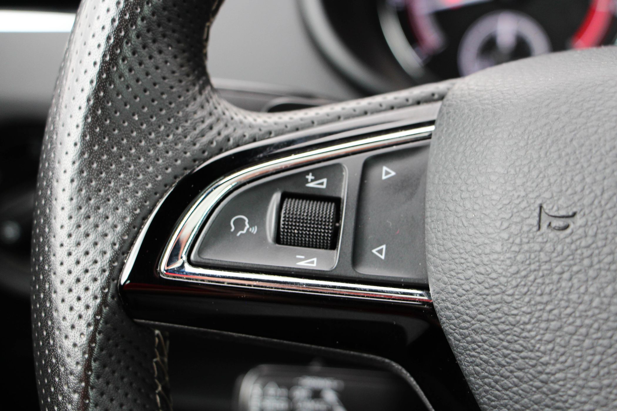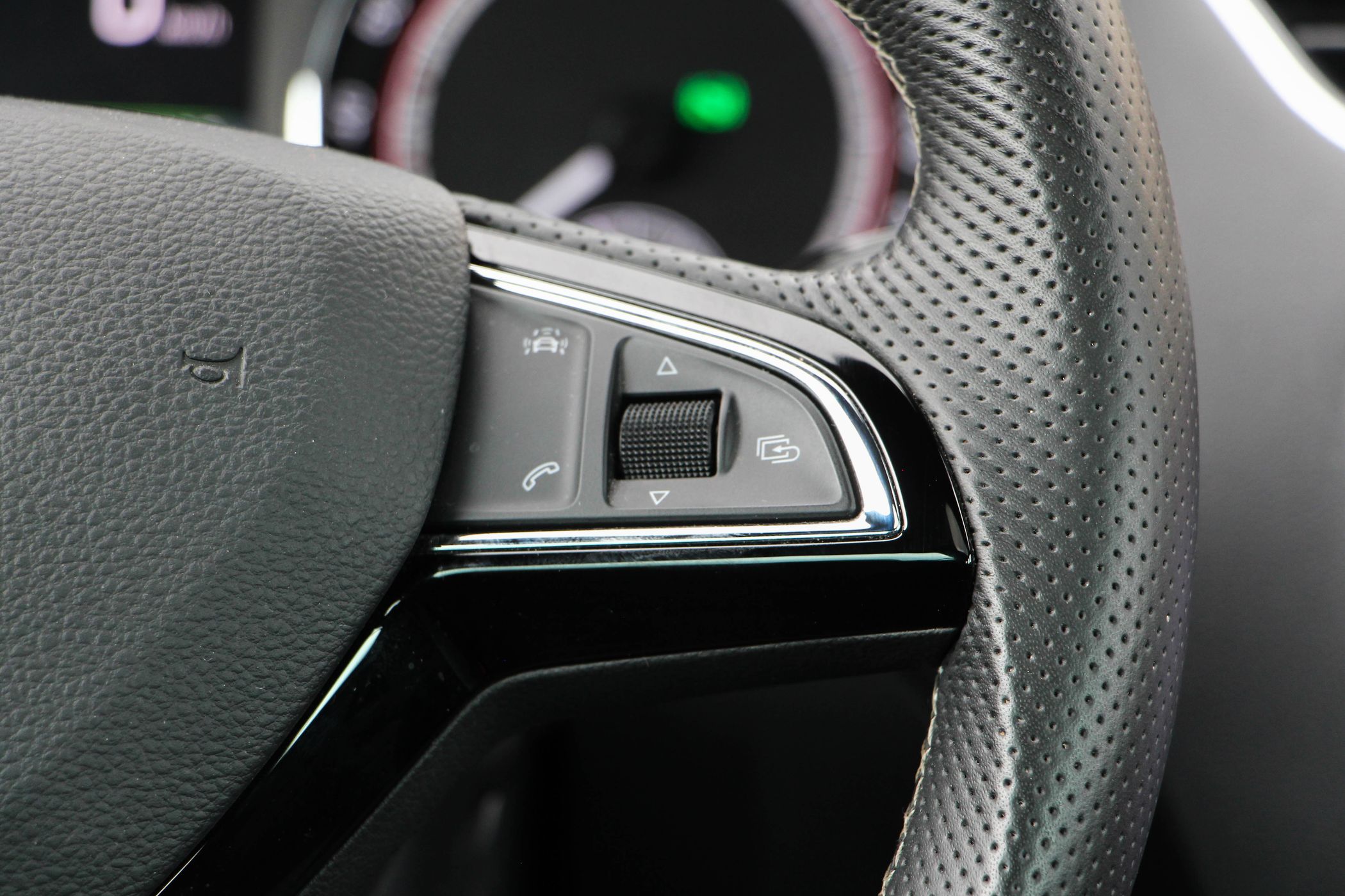 A sportülések nagyon kényelmesek és ízlésesen alakították ki az Alcantara, illetve bőr keveréket, a fejtámlákban az RS logóval. Szintúgy feltűnik a lapított aljú, bőrbevonatú kormánykeréken is a logó, de sokkal fontosabb, hogy az RS-ben nem érzem azt a kormány-holtjátékot, amely amúgy jellemző a többi Octavia modellre. Ha nagyon szőrszálhasogató akarok lenni, akkor a külön karon található tempomatot említeném negatívumként, mert kényelmetlennek éreztem a hozzáférést. Emellett a panorámatető felől érkeztek kellemetlen nyöszörgő hangok, például járdás parkolásnál a padkán felvánszorogva.