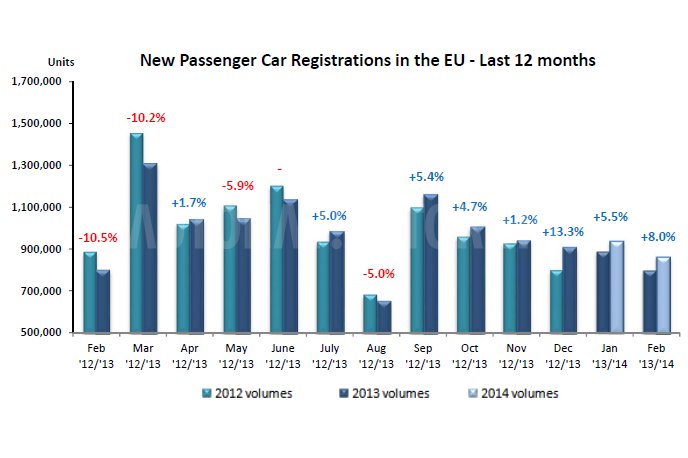 Erősödik a gazdaság, az autóforgalmazók meg lenyomták áraikat. A kettő együtt elég volt ahhoz, hogy a 2013 februárjában eladott 831 371 eladott autóhoz képest idén februárban már 894 730 új autó került nyilvántartásba az Európai Autógyártók Szövetsége (European Automobile Manufacturer’s Association, ACEA) szerint. Az Európai Bizottság az euróövezetben 1,2 százalékos gazdasági emelkedést prognosztizál az idei évre. Ezzel folytatódhat a többéves visszaesés után a tavaly megkezdődött emelkedés. A VW csoport 7,2 százalékkal teljesített jobban idén februárban, mint tavaly. A márkák eloszlása szerint a Volkswagen 0,8-et esett vissza, az Audi 12, a Skoda eladásai viszont 22 százaléknyit emelkedtek.[BANNER type="1"]