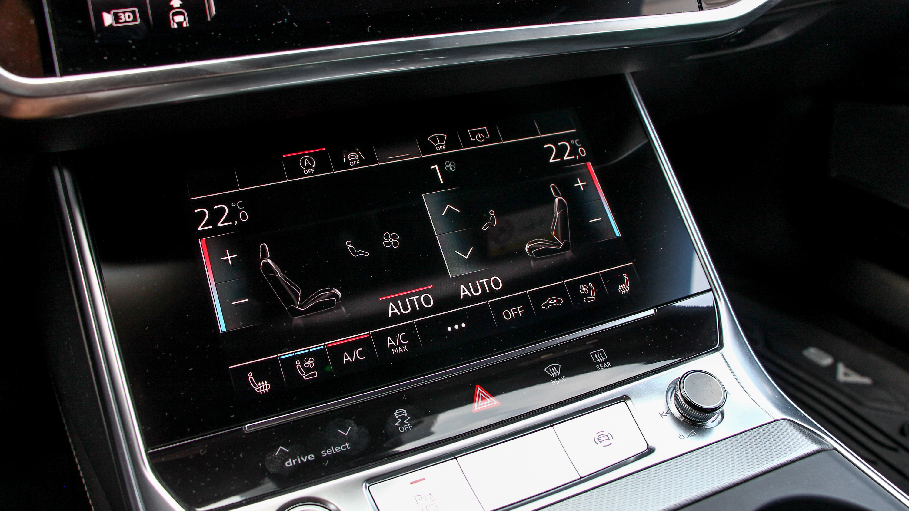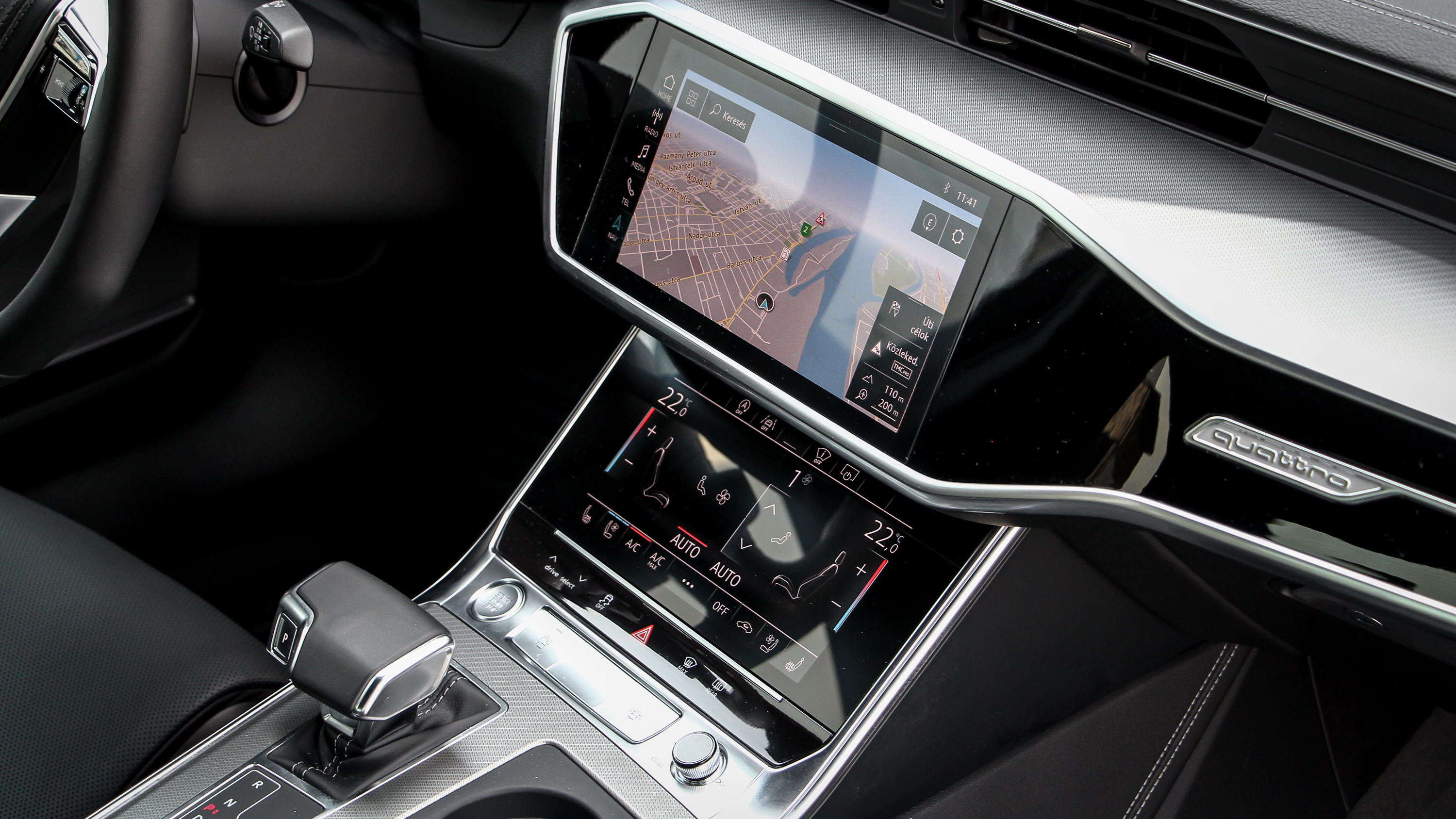 A kormányon kívül bent minden ugyanolyan, mint az A8-ban, ebben a színben viszont nagyon rideg és személytelen, de a temérdek selyemfényű fémelem és kiváló minőségű bőr miatt rendkívül vonzó. Úgy tűnik, a zongoralakk még mindig a prémiumszegmens szerves része, ám ha ilyen szépen össze van építve a multimédia 10,1 colos kijelzőjével, akkor részben érthető a jelenléte. A kijelző itt is touch response-os, vagyis nyomni is kell, nem elég érinteni, már ha úgy állítjuk be. Az alsó a klíma panelje és a navigáció billentyűzete, ami csak álló helyzetben használható, menet közben csak firkálhatunk rá, mivel ez az írásfelismerő panelje is.