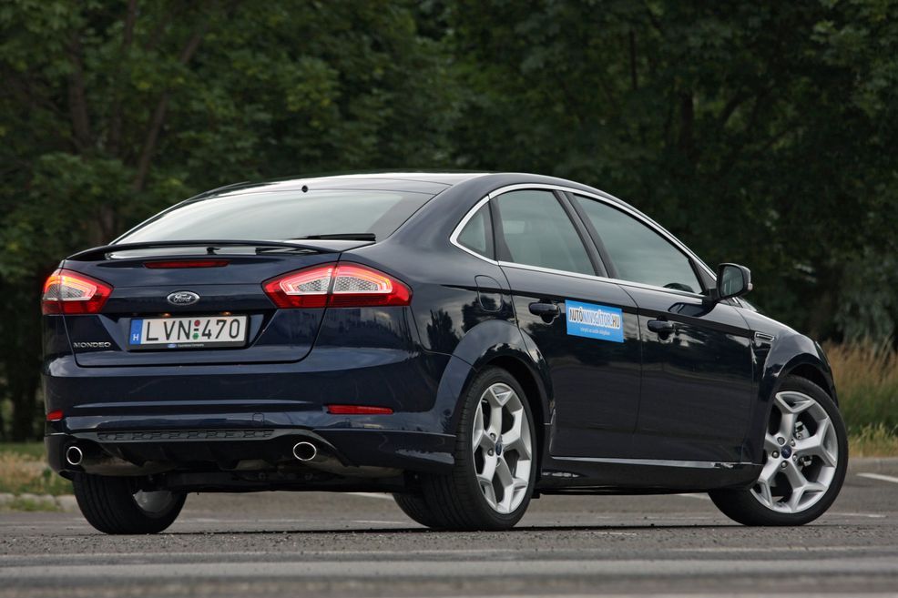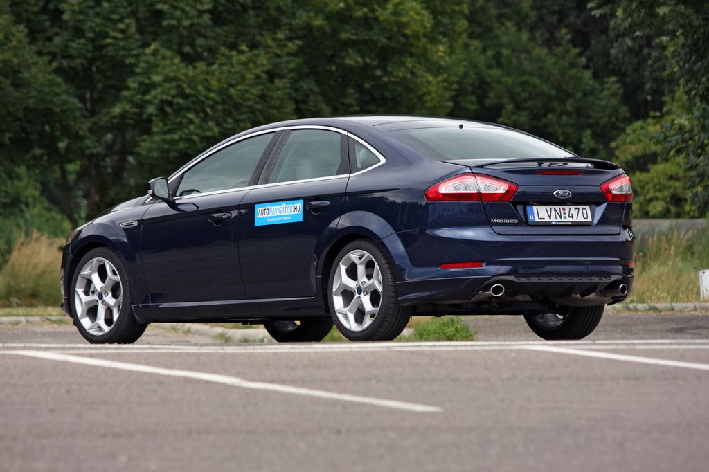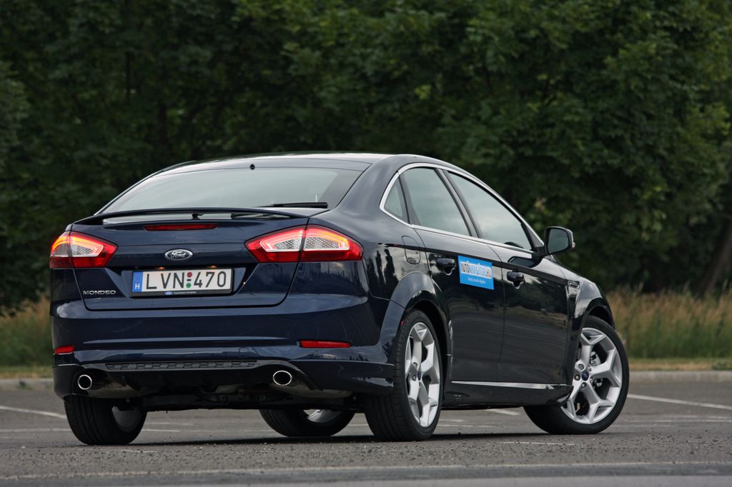 Ez itt a különlegesség, látszik ugyanis kívülről is, főként az extraként felszerelt, 19 colos (iszonyatosan alacsony oldalfalú, 235/40-es abroncsokat viselő) alufelniknek köszönhetően, hogy nem mindennapi Mondeóval van dolgunk, de azért azt senki sem gondolná, hogy ennyire sportos arcot mutat vezetés közben az óriási ötajtós. Nem is a menetdinamika az, ami letaglózó, hanem a kormánymű közvetlensége, gyors reakciója, a futómű elképesztő stabilitása. Ráadásul utóbbihoz és a peres abroncsokhoz mérten a csillapítás is nagyon jó, ilyen felnikkel, ilyen stabilitással, és hagyományos, acél rugókkal igazán bámulatos a Mondeo rugózási kényelme. Magyarán nem csak vaduláshoz, kényelmes utazáshoz is kiváló partner a csúcsmotoros, középkategóriás Ford. Autópályán feltűnően csendesen gurul, 130 km/óránál nem egész 2900/perc a motor percenkénti főtengelyfordulata, miközben a zajcsillapítás valóban elsőrangú (itt 67 dB(A) zajszintet mértünk, összehasonlításul a Mercedes-Benz CLS-ben 66-ot – autópályán tehát igazán nagyautós arcot mutat a városban is csendes, de ott a CLS-től például jobban elmaradó Mondeo).