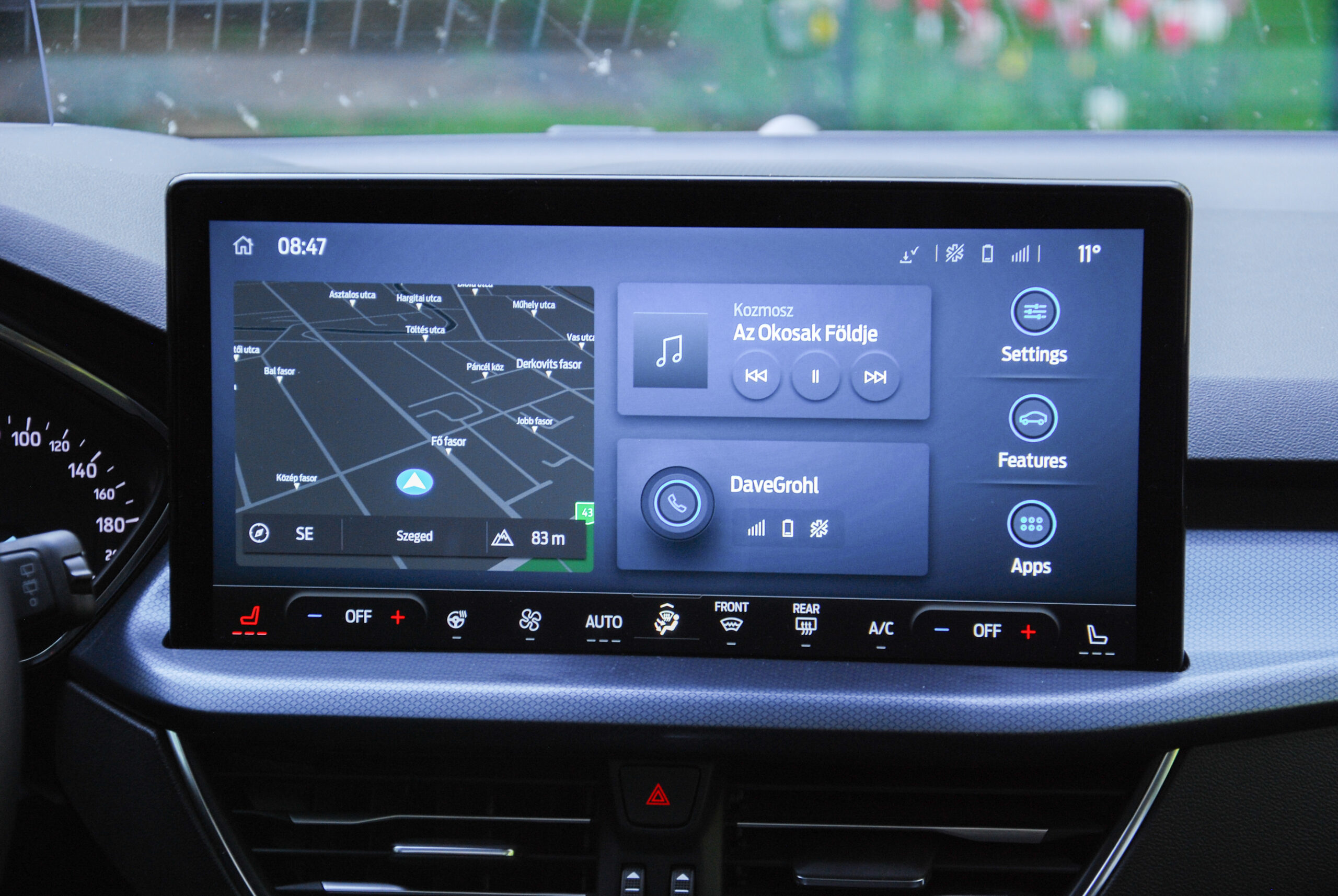 Ezen felül azonban szinte kizárólag pozitívumai maradnak az utastérnek. Kényelmesek az ülések, bőséges a tér mindkét sorban, korrekt mennyiségű és méretű tárolót kapunk, és így tovább. Egyedül a hátsó ülések szellőzőit hiányoltam, még úgy is, hogy az első ülésekre összpontosított, a főképernyőről vezérelhető, kétzónás klímaberendezés egyébként képes volt kontrollálni a hőmérsékletet ebben a sorban is. Ugyanígy aligha lehet panasz a 608 literes csomagtartóra, ami a normál kombi tesztautó esetében - valószínűleg apró, elsőre fel nem tűnő módosítások miatt - 635 litert számlált.