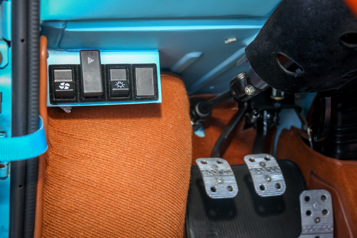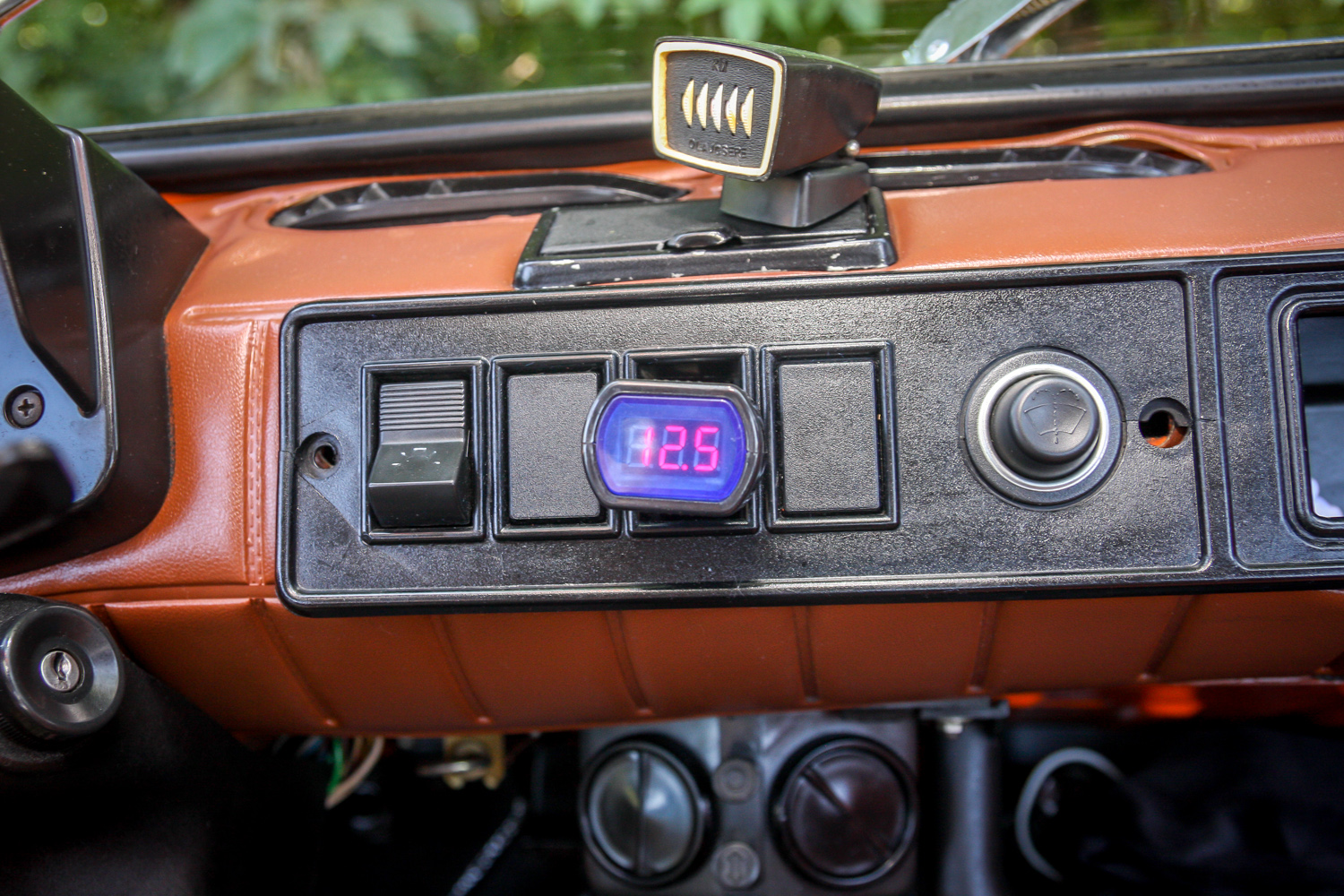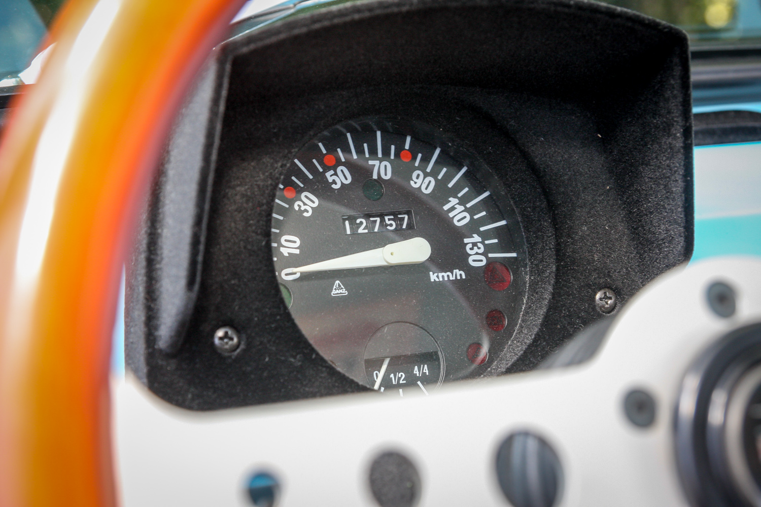 Ennél kevesebb műszer és kapcsoló nem igen lehetne. A legviccesebb talán a műszerfal tetején látható, az olajcsere esedékességére emlékeztető kis számláló