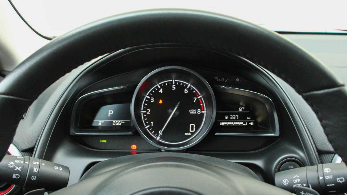 Fejvakarást egyedül az automatikus sebességváltó okozott. Az összkerékhajtás és az automata váltó egyébként csak az erősebb, 150 lóerős, kétliteres benzinmotorral választható. Igazából a 121 lóerős változat is megfelelően mozgatja az autót, és az összkerékhajtás sem létfontosságú a CX-3-hoz, de érthető, ha valaki nagyobb erőtartalékra vágyik. Viszont nagyon furcsának találtam, hogy a sebességváltó rendre elpörgette a motort 4000-es fordulatig. Az tény, hogy a maximális teljesítményt 6000-es fordulatnál adja le, de a 206 Nm forgatónyomaték már 2800-as fordulatnál megérkezik. Több olyan CX-3 tulajdonost is megkérdeztem, akiknél ugyanez az automatikus váltóval felszerelt példány teljesít szolgálatot, de senki nem érzékelt olyasmit, amit velem művelt a tesztautó. Van egy üzemmódválasztó gomb is a CX-3-ban, amellyel sportmódban is lehet közlekedni. De mindegy volt, hogy azt kiválasztottam-e vagy sem, a váltások mindig 4000-es vagy ahhoz közeli fordulatszámnál történtek, hacsak nem vettem a kezembe az irányítást a kormánykerék mögötti váltófülekkel. A többi tulaj állítása szerint náluk legfeljebb 3000-ig pörög a motor, és ott már következik a váltás.