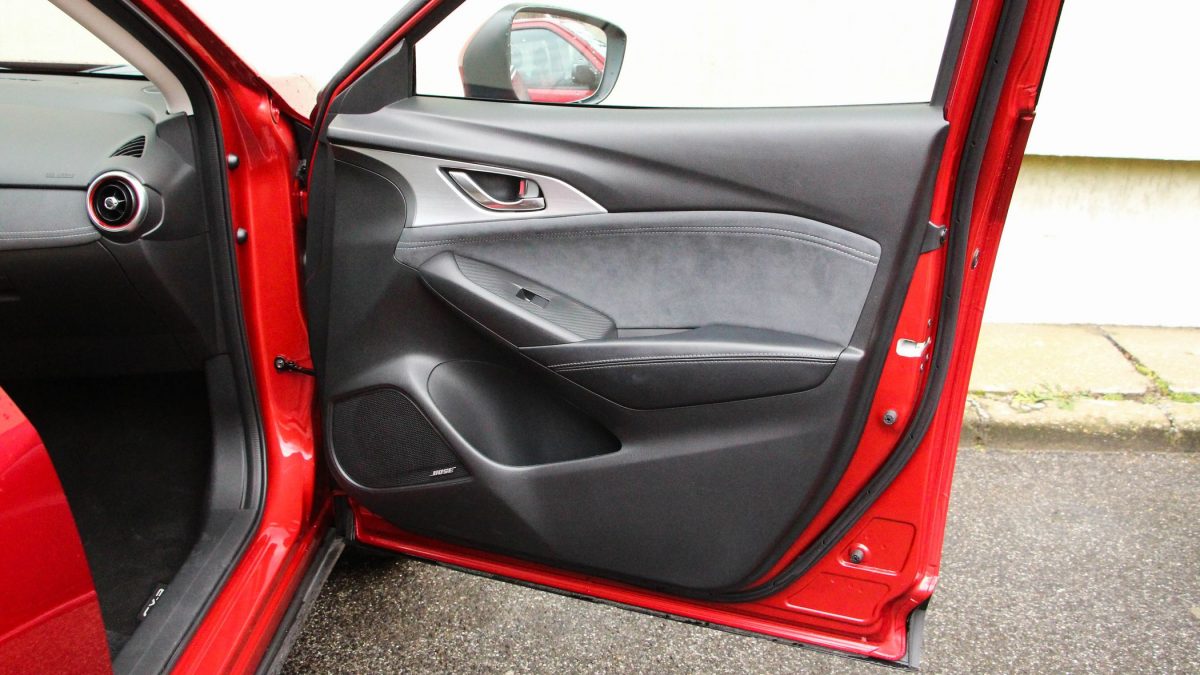 De vissza az utastérbe. A bőrkárpit mellett az ajtók burkolatán és a műszerfalon felbukkanó Alcantara igényes megoldás, öröm minden pillanat, amikor végigsimít rajta az utas keze. A könyöktámasz ugyan nem állítható, de így is kényelmes, és ahogy a frissítés előtt, most sem lehet belekötni az ergonómiába. Az infotainment rendszer menüjében a tekerőgomb segítségével könnyű boldogulni, a vezető előtt pedig HUD jeleníti meg a fontosabb információkat, egy külön felnyíló műanyag felületen. Továbbra is imádom egyébként az elém táruló látványt, mert olyan érzés beülni a CX-3-ba (és a Mazda2-be is), mint egy vadászgép pilótafülkéjébe.