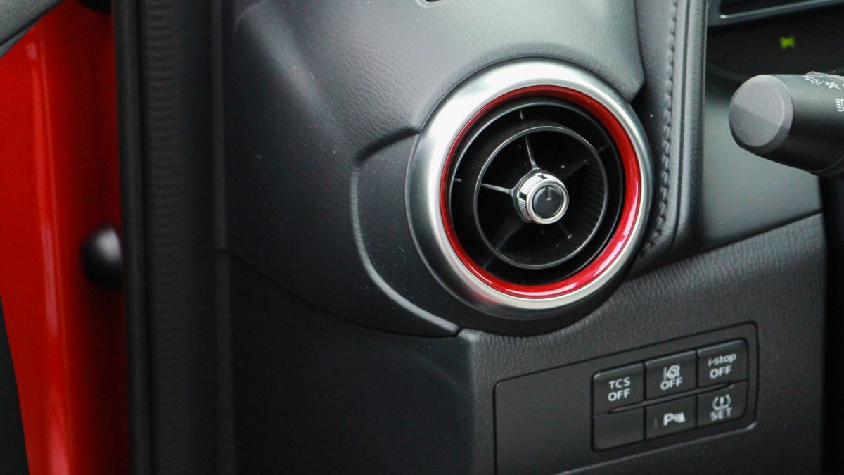 A kerek szellőzőnyílásokba jutott egy kis piros díszbetét