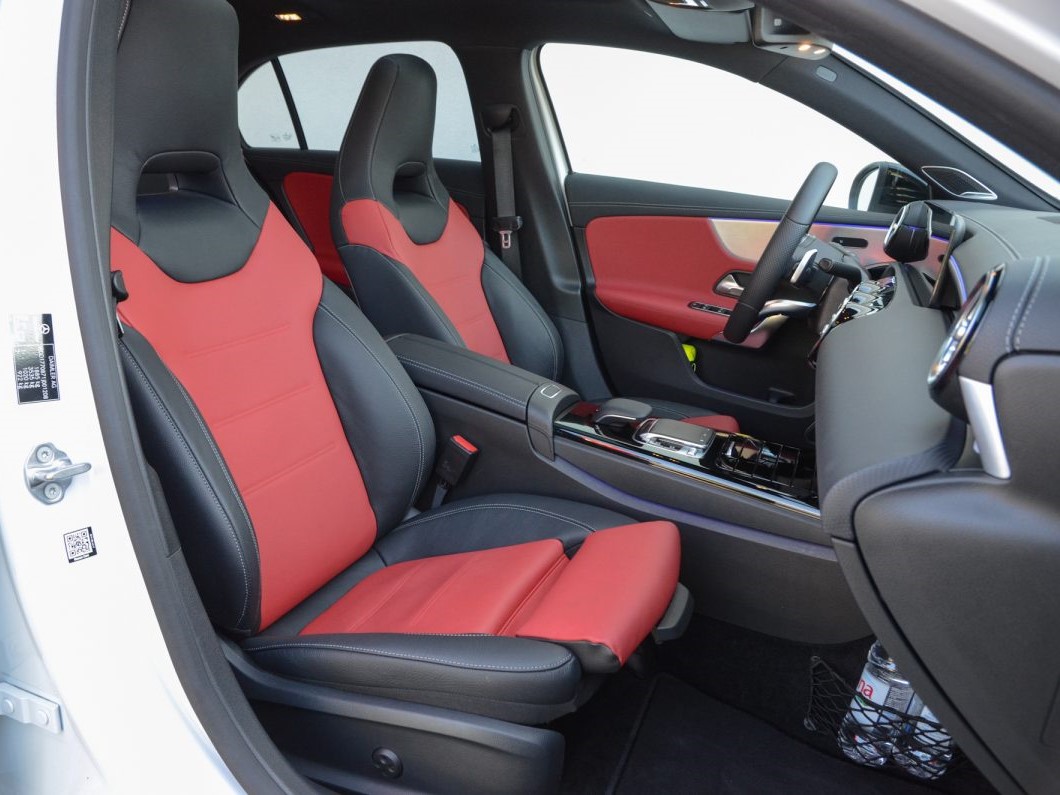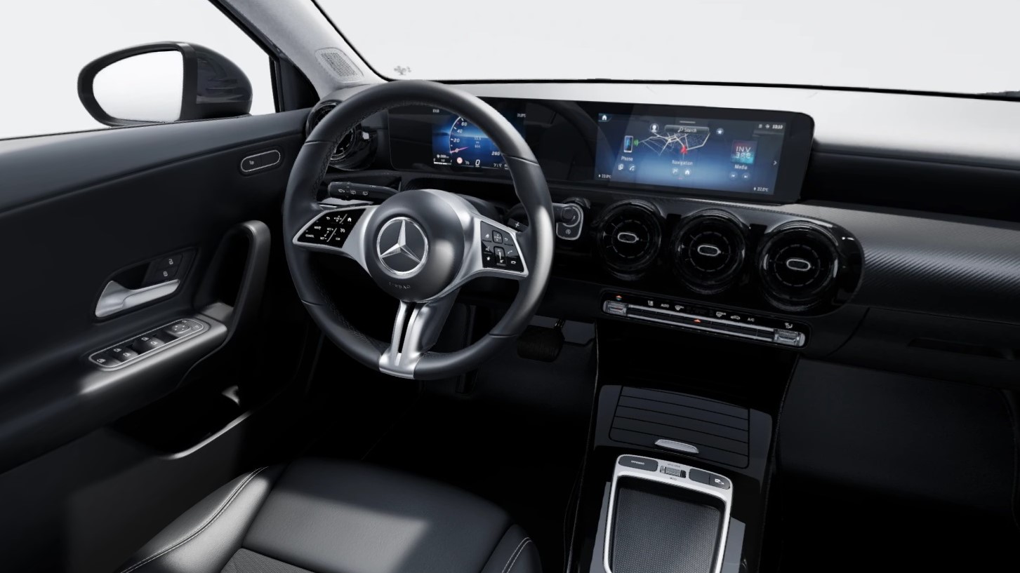 A beltérben félbőr ülésekkel és multifunkciós bőrkormánnyal fogad alapáron az A-osztály, de természetesen megvan a négy elektromos ablak, a 10,25 colos, navigációs MBUX központi érintőképernyő, illetve a digitális műszeregység is, bár ez utóbbi kisebb a konkurensek hasonló egységénél.