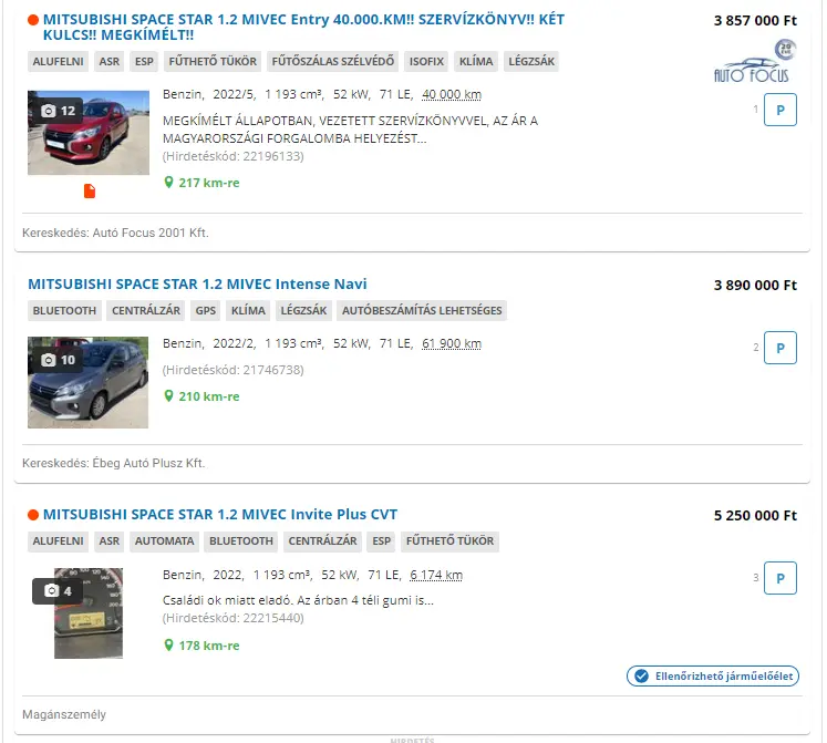 Míg 2021 első felében 2,89 millió forintba került a legolcsóbb új autó, amely az előző generációs Dacia Sandero volt, 2022 januárjában már 3,56 milliós vételárral a nála jóval kisebb Mitsubishi Space Star jelentette az újautó-piac belépőjét. A következő fél évben ennek a modellnek az alapára 4,33 millió forintra emelkedett. Ennyi pénzért még légkondi nélkül kínálta az 1,2 literes, 71 lóerős szívó benzinmotorral hajtott, 3,85 méteres, nem egész 900 kilogrammos miniautót a Mitsubishi. Legolcsóbb légkondis verziója 4,76 millió forintba került, de ennyiért már Kiát is választhatott a vásárló, 7 év vagy 150 000 kilométeres garanciával.
