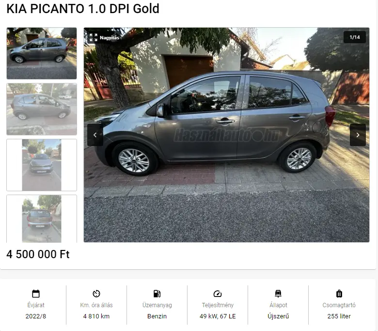 Ilyen Picantót jelenleg újonnan 6,2 millióért kapni a frissítés után, így valahol érthető az egyetlen, évjárat terén is stimmelő példány 4,5 milliós irányára. Ebből akár arra is következtethetnénk, hogy a Picanto alig 50 ezer forintot veszített az értékéből újkora óta az áremelkedés miatt, ám az eladó példány egy bőven nem alapáras Gold felszereltség, ráadásul nem egész 5000 kilométert futott a 3 év alatt. A 2021-es és 2023-as példányok jelenlegi árai alapján egy ilyen Picanto 3,5 és 4 millió forint között érhet reális óraállással és alacsonyabb felszereltséggel jelenleg.