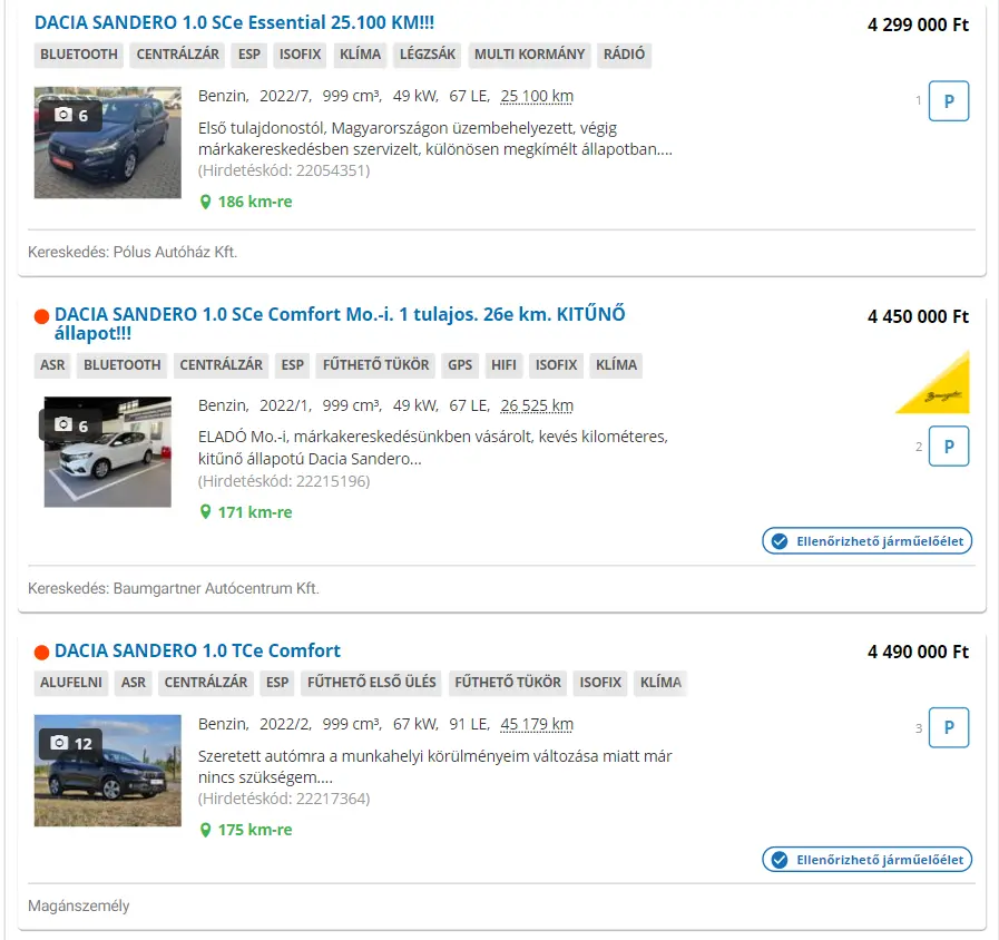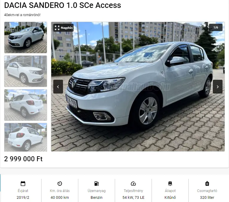 Mostanra azonban már a 3 éves Sandero is kevesebbe kerül az újkori áránál Magyarországon. A fenti listában mindhárom autó klímás, de akad magasabb felszereltséggel és nagyobb motorral szerelt példány is az újkori alapár alatt. Fontos megjegyezni, hogy itt még a legjobban felszerelt, alig futott példányok sem érik el az 5 milliót, ami újkorában a fapados változat klímával megfűszerezett verzióját jelentette.