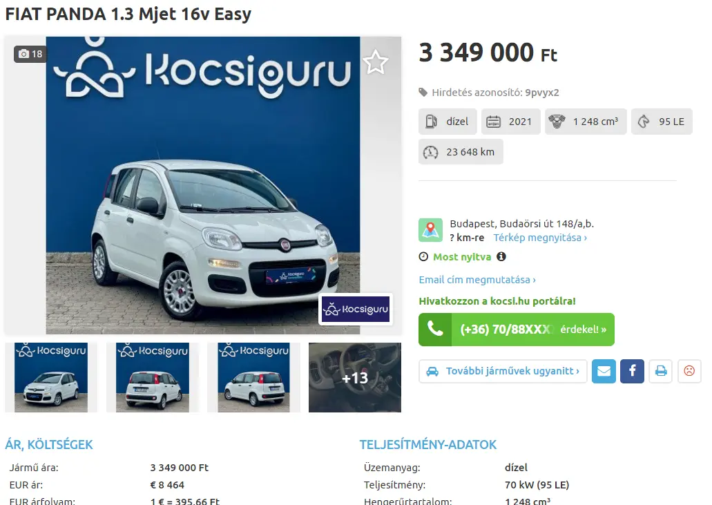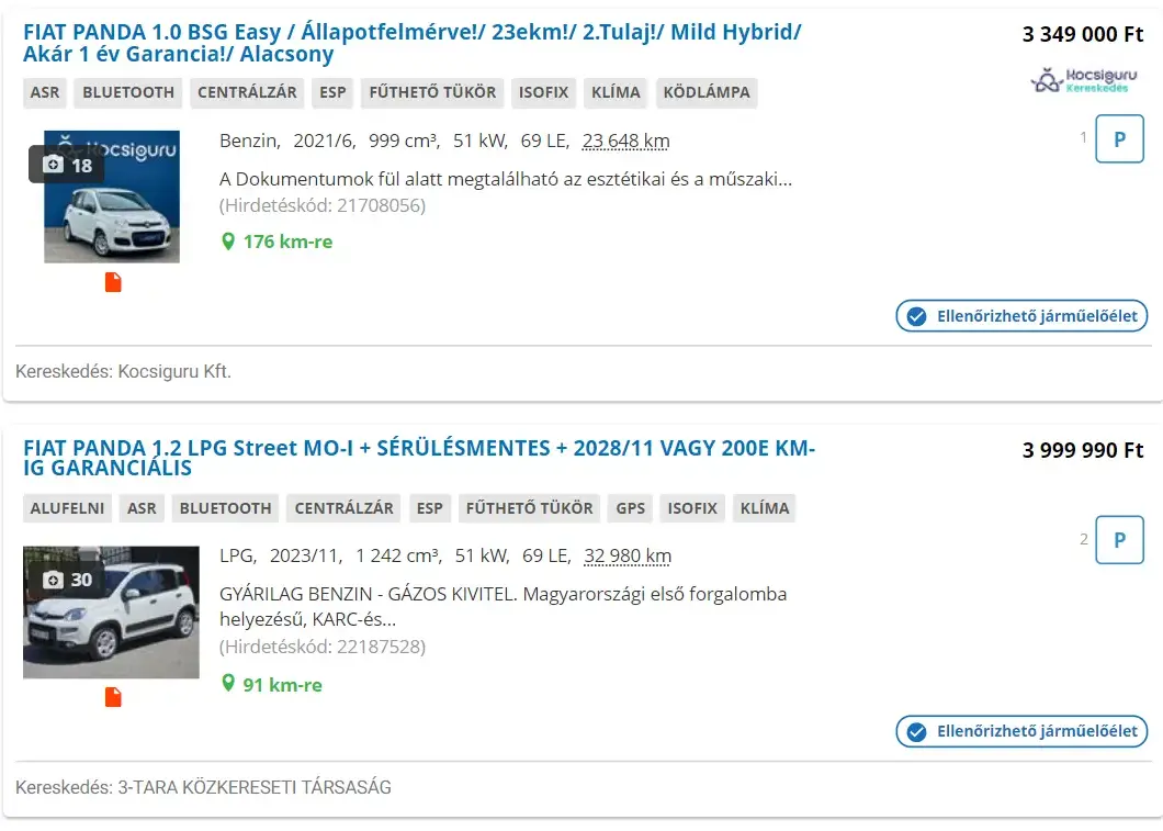 Jelenleg sajnos egyetlen 2022-ben gyártott Pandát sem találtunk a nagyobb használtautós oldalak kínálatában, ám 2021-es és 2023-as példány is akadt helyette, így nagyjából be lehet lőni a típus jelentős értékvesztését. Alig 1 évvel öregebb Pandát ugyanis mindösszesen 23 ezer kilométeres futásteljesítménnyel is kínálnak eladásra 3,5 millió alatt, ami 30 százalék feletti értékvesztést jelent. Mindezt úgy, hogy a legolcsóbb ajánlat akár dízel is lehet: ugyanazt az autót két különböző erőforrással hirdeti egy kereskedés két különböző felületen. Hogyha az említett Panda tényleg dízel, akkor még rosszabb a helyzet, ám az eladási árat tekintve semmiképp sem jártak jól azok, akik újonnan 5 millió forint felett hagytak ott egy ilyen Fiatért.
