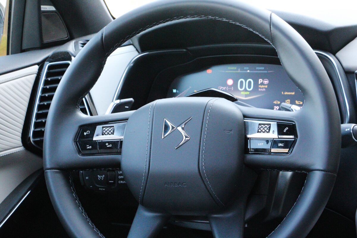 Az utastér a külsővel ellentétben nem esett át gyökeres változásokon. Elsőbálozóként nagyon szokni kell a kezelőszervek elhelyezését, de aki ült már DS-ben, otthonosan fog mozogni. Az indítógomb például a műszerfal közepén, az érintőképernyő felett található, ám ez a hajtáslánc életre keltésével együtt egy analóg órát is elénk varázsol. Az első ajtópaneleken kár bármiféle kapcsolót keresni, a kilincset leszámítva csak a kellemes tapintású Nappa bőr található rajta egy tárolórekesz kíséretében. Az ablakok a kardánalagútról vezérelhetőek, szerencsére itt azért jókora gombokkal oldották ezt meg, így könnyű hozzászokni.