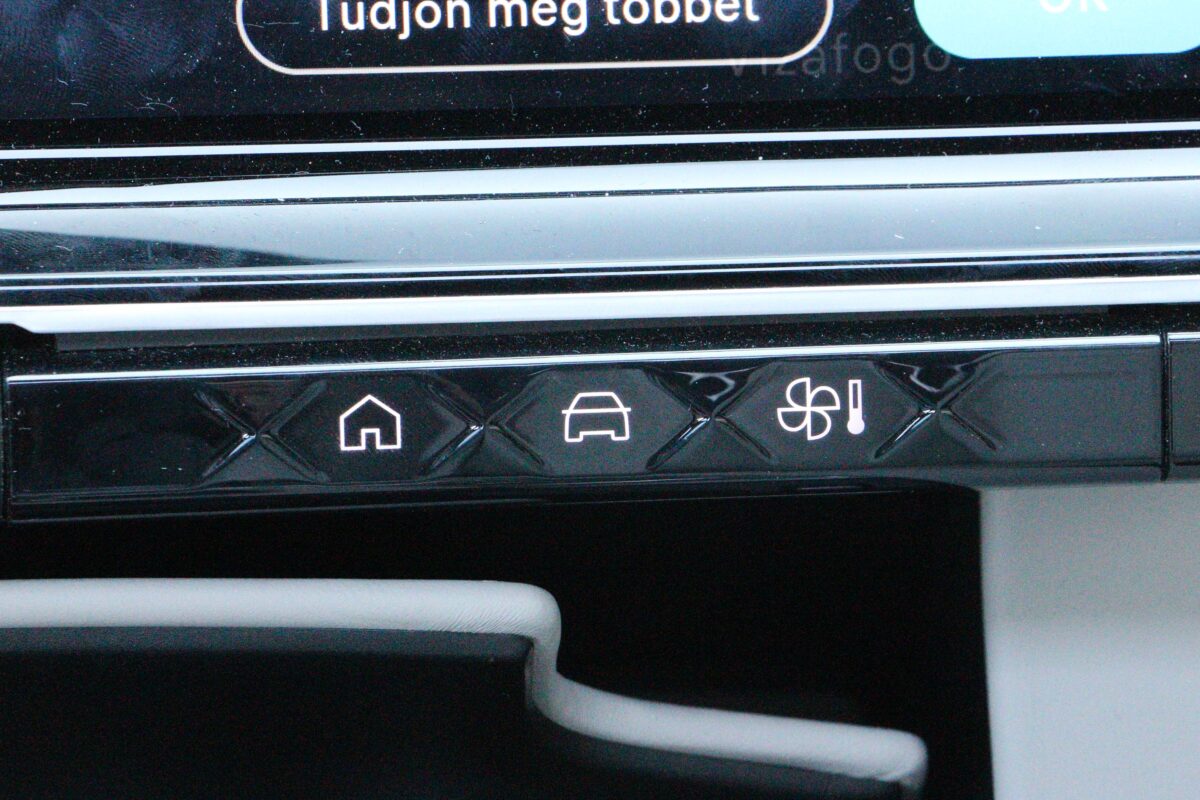 A műszerfalon két 12,9 colos kijelző található, a középső természetesen érintőképernyő. Kissé fájó, hogy a klímát is kizárólag erről lehet szabályozni
