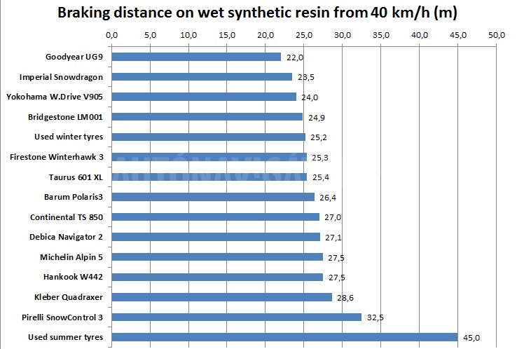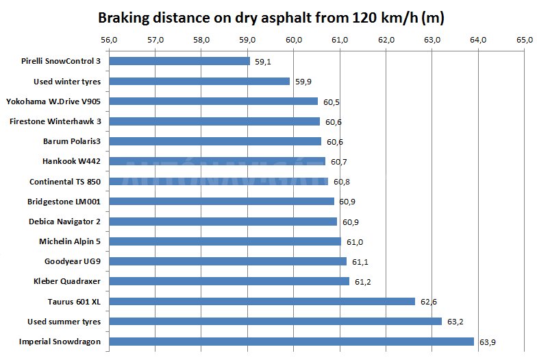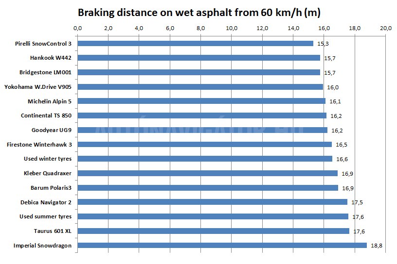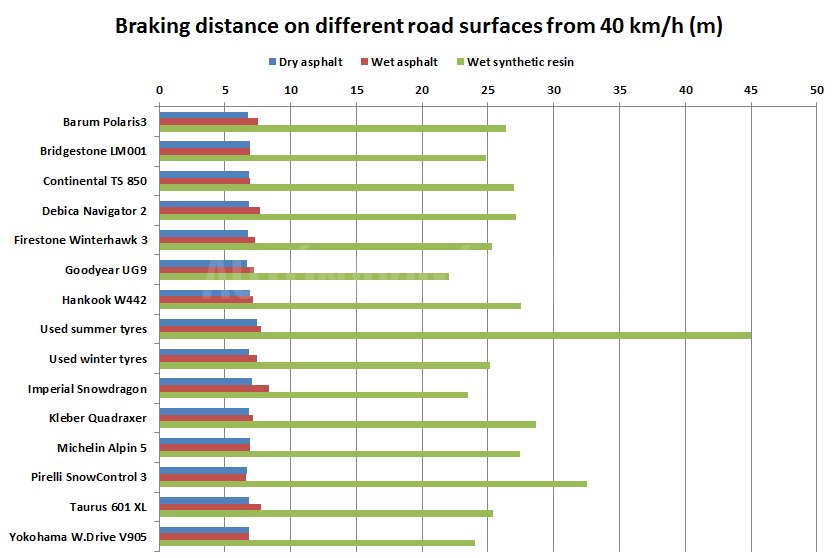 Nézzük meg, hogy mi a helyzet, ha tél van és havas, jeges az út. Ilyenkor a fékutat elsőként a gumiabroncs minősége határozza meg. A fékeknek kevésbé van szerepe, ezért itt el is tekintünk a 10, illetve 20 százalékos fékhatáscsökkenéstől. Ebben az esetben az alábbi féktávolságok adódnak.