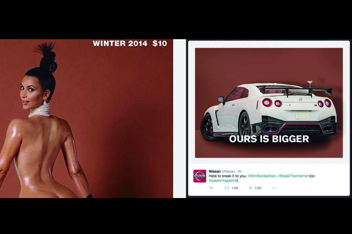 A bulvársajtót most éppen a Paper Magazine számára készült fotóival tüzeli a celebtündér Kim Kardashian. Kardashian szereti mutogatni magát, közismert arról is, hogy feneke a 90-60-90 arányú barbimodellekénél khm, kissé nagyobb. Nos a Nissan globális Twitter csatornáját kezelő kommunikációs csapat (gyaníthatóan nem egyszemélyes munkaként) frappáns választ adott a képek körüli hájpra.[BANNER type="1"]