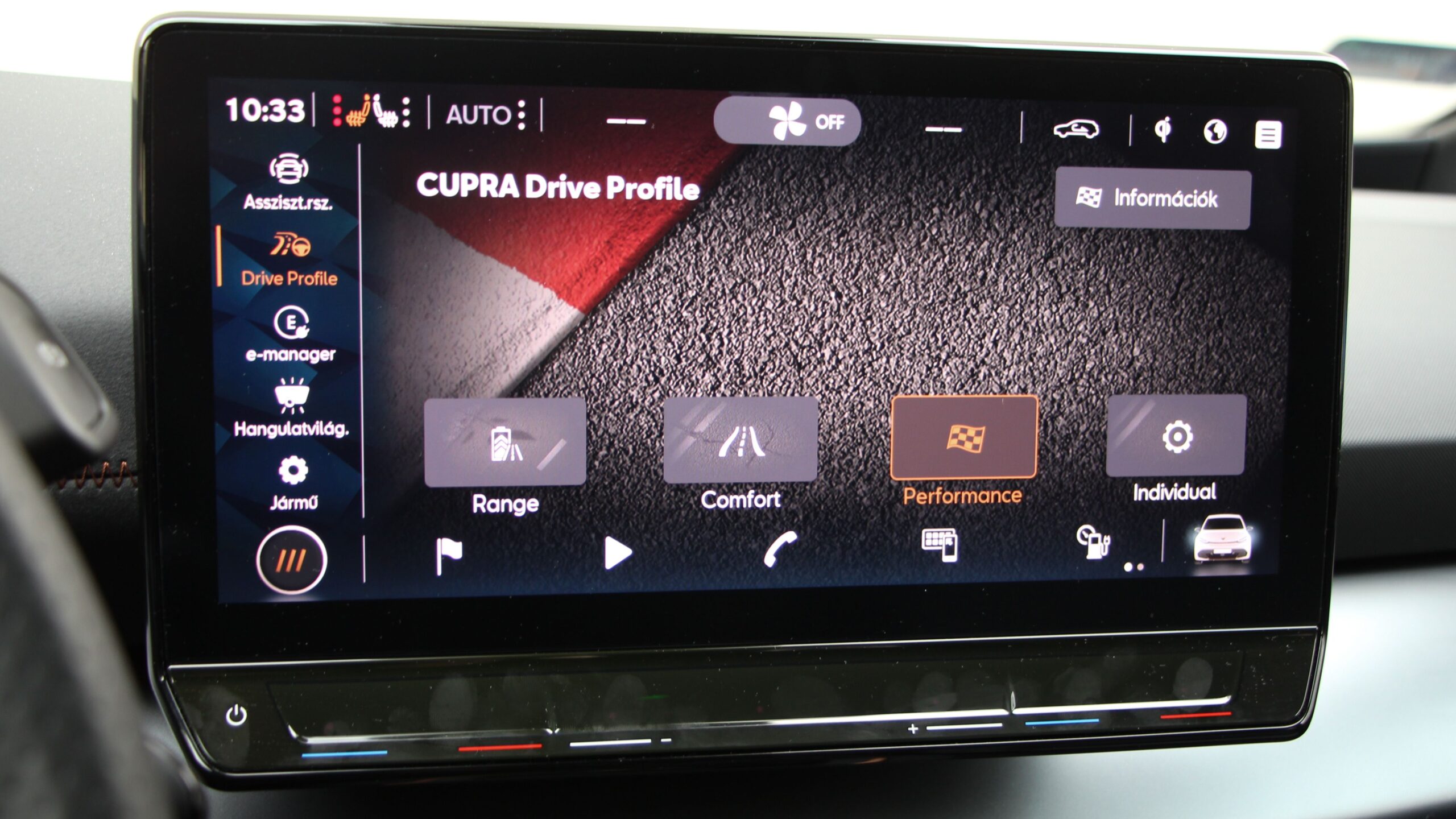 Bent is próbálták az ID.3-tól jól elkülöníteni a hangulatot a Cupra emblémás sportkormánnyal, a műszerfalon végigfutó díszbetéttel és a rézszínű elemek felbukkanásával. Külön kiemelném a világoskék üléshuzatokat, amelyeken apró kis bevágások sorakoznak szintén a réz csillogásával, igaz ez masszívan feláras, de elöl ezek már kimondottan „kagylóülések” 790 480 forintért. Egyébként, ha látszatra nem tűnne tágasnak, azért itt nem érheti szó a ház elejét. Hátul is kényelmes átlagos magasságú felnőttek számára, persze a csomagtér láttán senki nem fogja összecsapni a tenyereit, hogy „hű mekkora”. Természetesen a gyári adatok szerint alapból 385 literes csomagtérrel azért lehet mit kezdeni, főleg, hogy 1267 literesre bővíthető. Szóval az utastér egyetlen gyenge pontja az infotainment rendszer, illetve annak 12 colos érintőképernyője. Egyrészt túlbonyolították a menürendszert, amit amúgy el lehetne érni egyetlen bökéssel, ahhoz itt több kell, emellett lassan is reagál, de a legnagyobb bűn a képernyő alsó részének kivilágítatlan része, amin a hőmérsékletet lehet szabályozni, illetve a hangerőt. Persze utóbbit a kormánykerékről is lehet szerencsére, de a klímakezelés szintén kacifántos módon menüből működik, vagy a hőfok ezen a teljesen észszerűtlen, vékony csíkon.