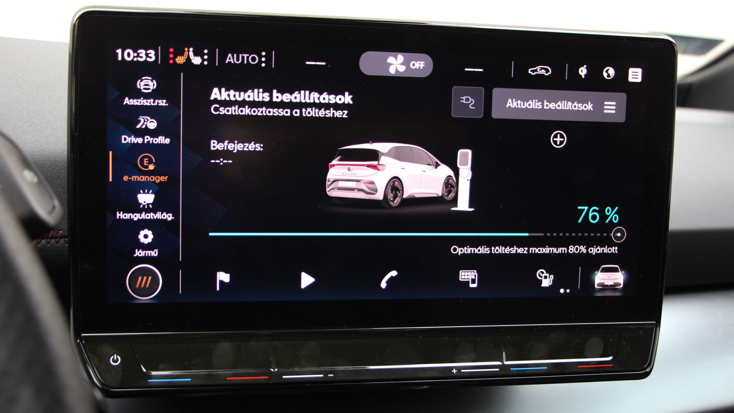 Ára? Húzós. Nem az alap 16,5 millió, mert az már egy teljesen átlagos villanyautó ár. Inkább az, hogy az extrák pipálgatásával mennyire elszaladhat. A már említett tételek mellett a tesztautóban ott volt még többek között a Dynamic csomag. Majd’ el felejtettem, ez adaptív lengéscsillapítást ad, de a különböző üzemmódokat szintén jól elrejtették a menürendszerben, és oly nagy változást nem is idéznek elő, de állítólag hamarosan rendelhető lesz a megszokott módon, a kormánykerékre helyezett Cupra gombokkal is. Továbbá félmilliós csomaggal érkezik az adaptív tempomat, a holttérfigyelő, a tolatókamera és a táblafelismerő, néhány további kiegészítővel, valamint a MODE 3 töltőkábel (Type 2, 32A) sem alapáras. Így viszont már közelíti a 20 millió forintot a Born ára, amiből szerencsére lejöhet az 500 ezer forintos, a konfigurátorban alapból kínált kedvezmény.