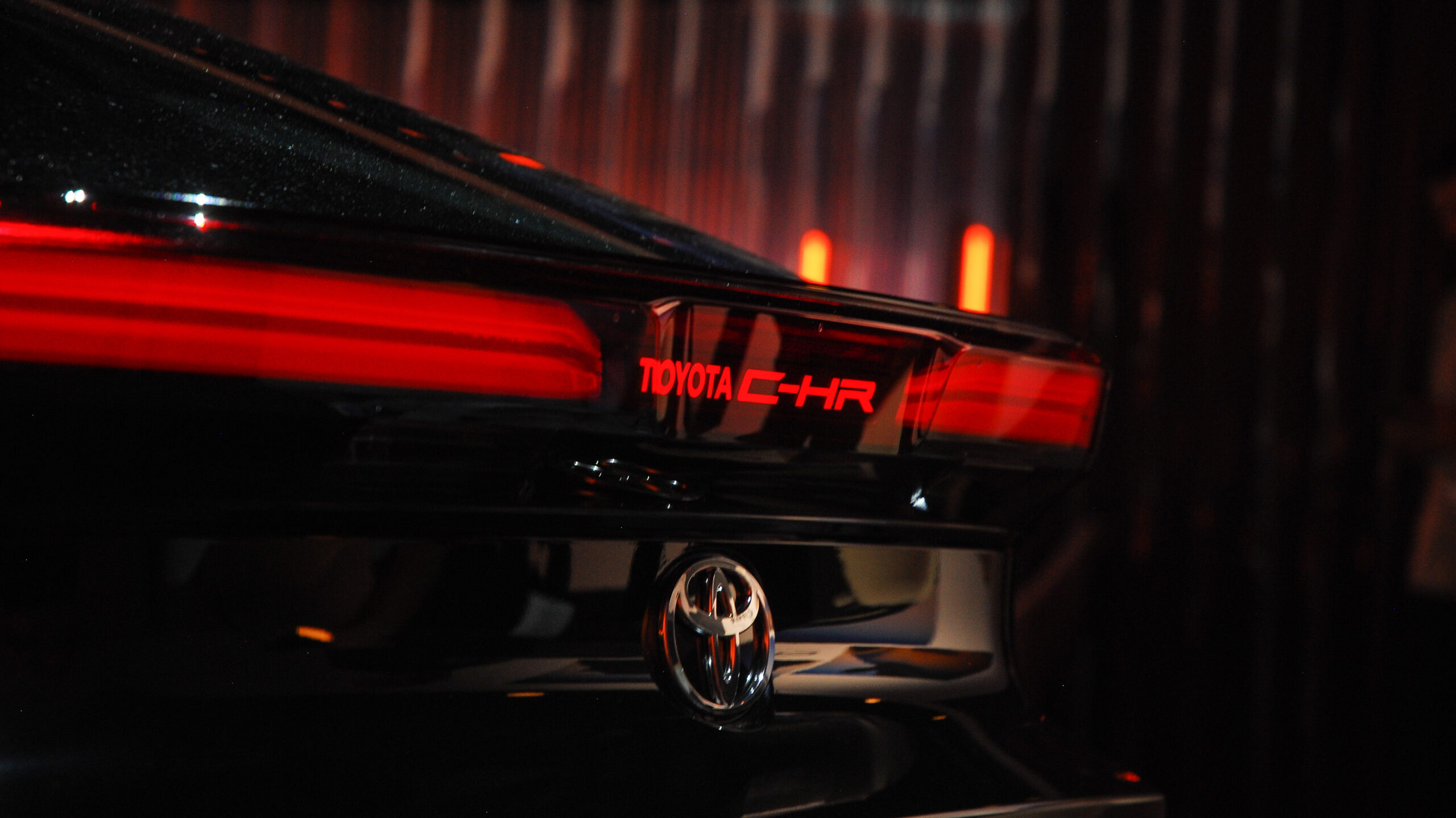 Az egybefüggő hátsó lámpatest még egy világító C-HR feliratot is kapott köszöntőfény gyanánt