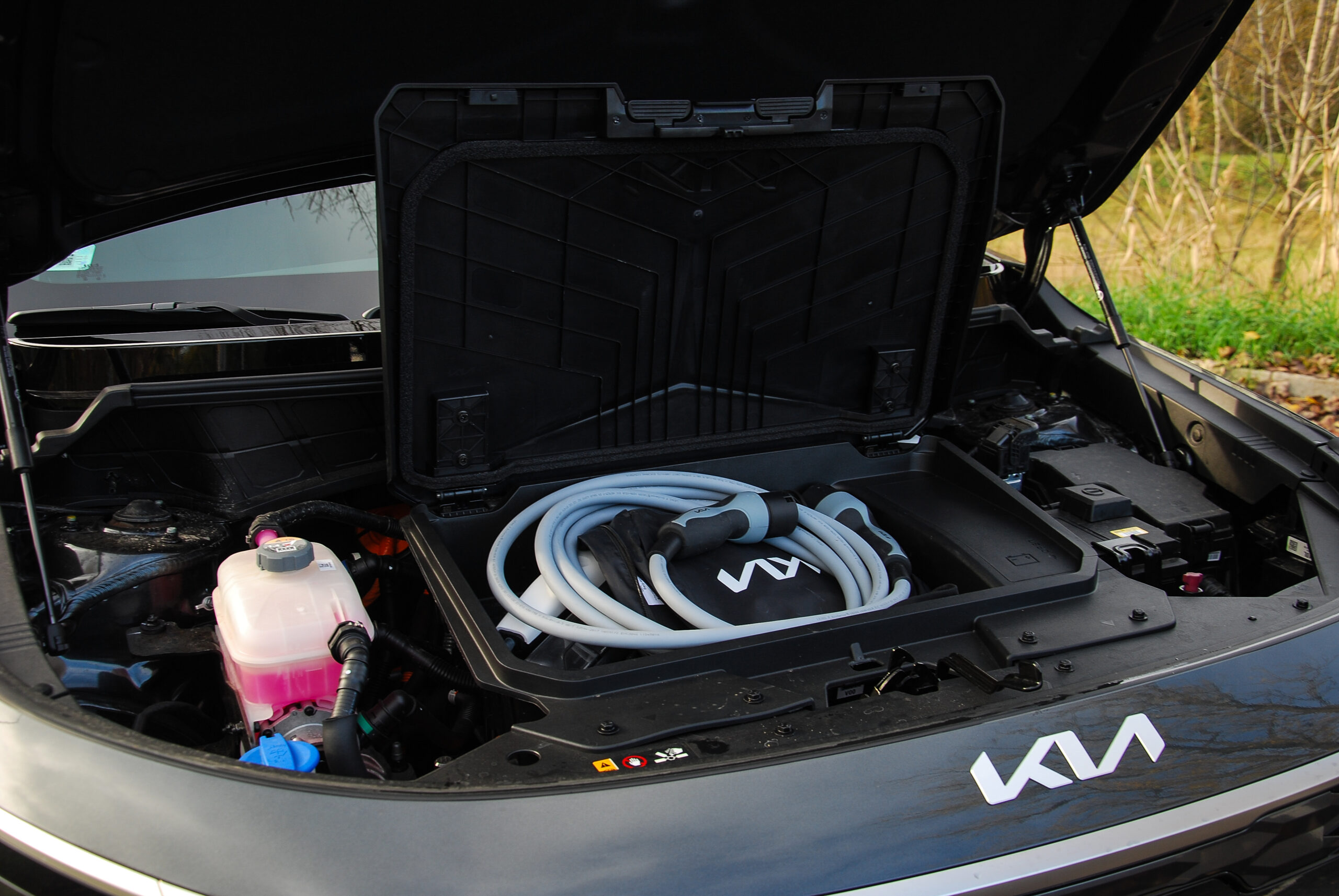 Nem véletlen azonban, hogy nem láttunk töltőkábeleket a csomagtartóban, ezek saját helyet kaptak az autó orrában