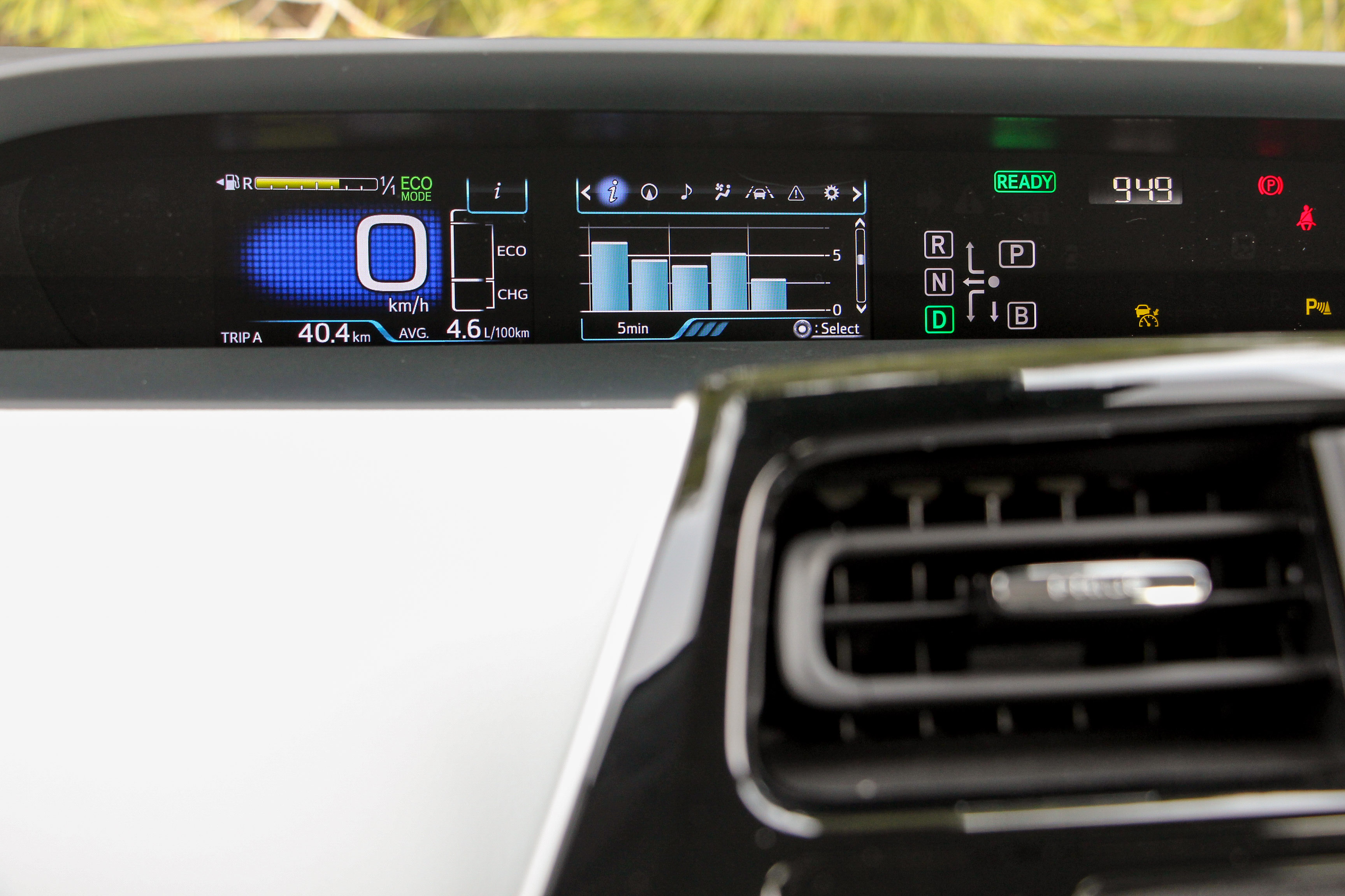 A műszerfal információs sávjában a bal oldali blokk fix az alapadatokkal, a jobb oldali lapozható, klíma, audiórendszer, telefon, iránytű, hibrid-információ is megjeleníthető